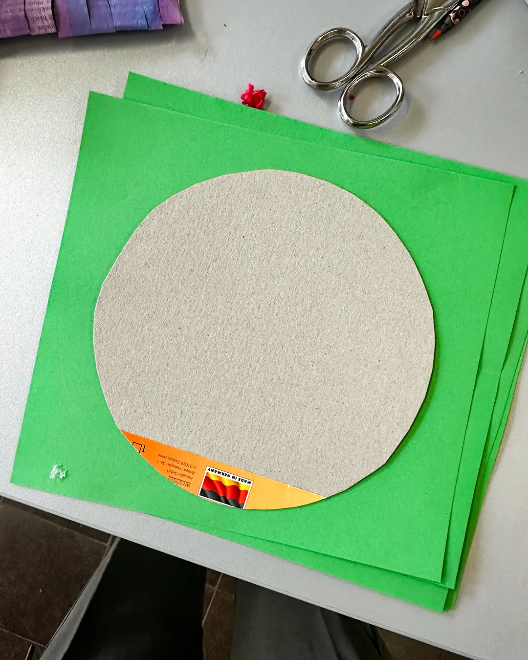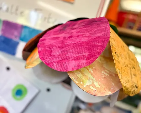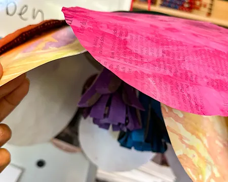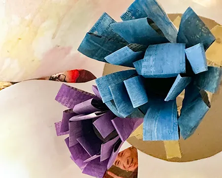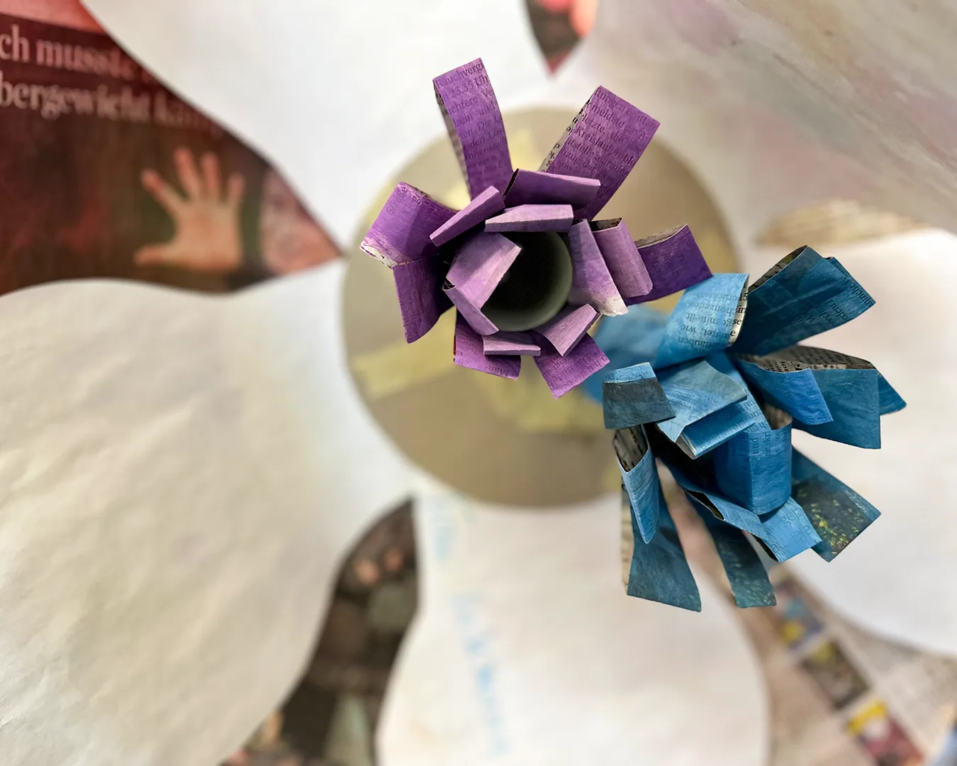 Schritt für Schritt werden die großen Blumen erstellt. Bemaltes Zeitungspapier und geschnittenes Tonpapier werden zusammen gebunden. Kinder arbeiten mit Farbe.