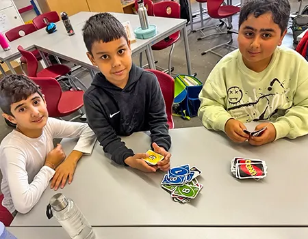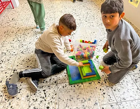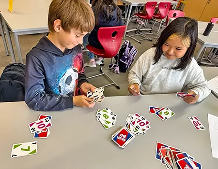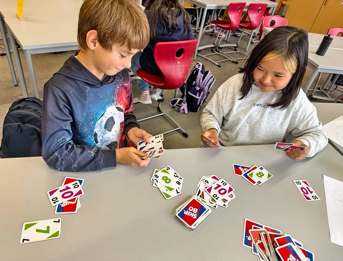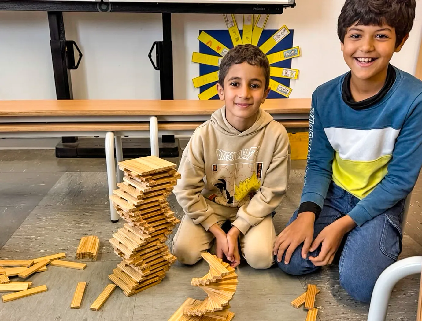 Schüler*innen spielen gemeinsame Spiele im Klassenraum und auf dem Flur.