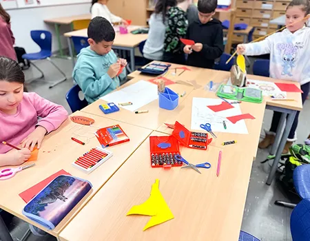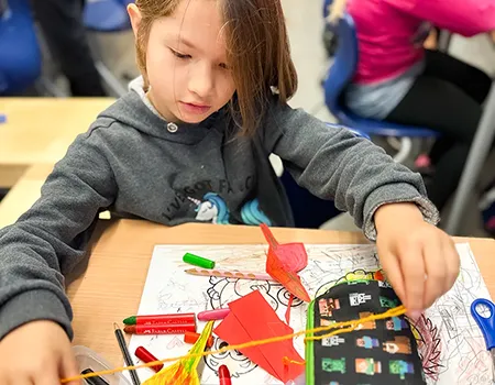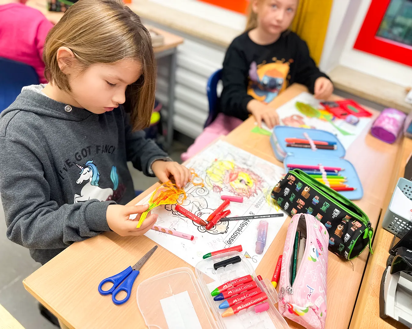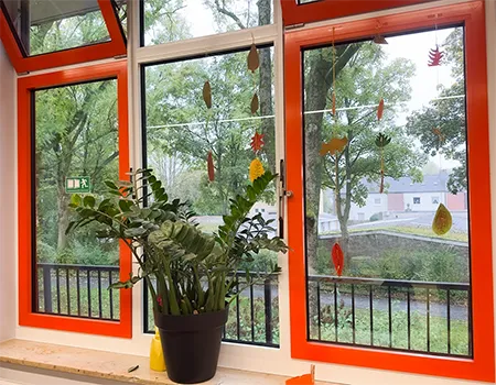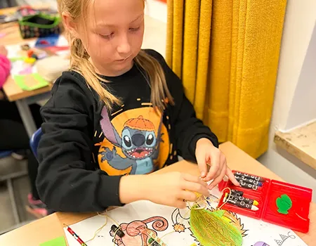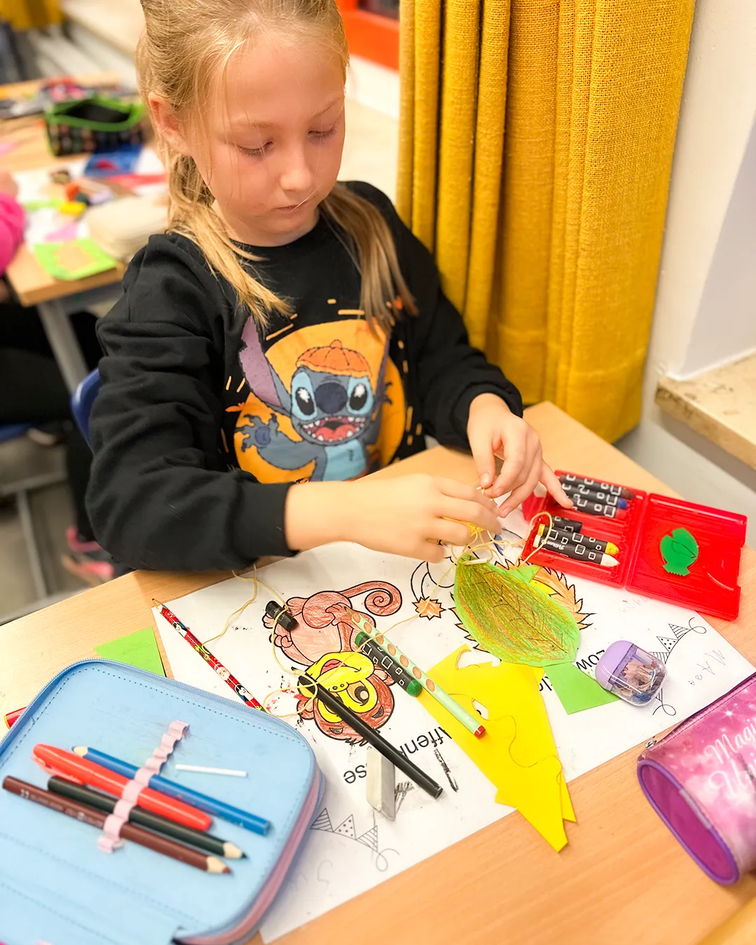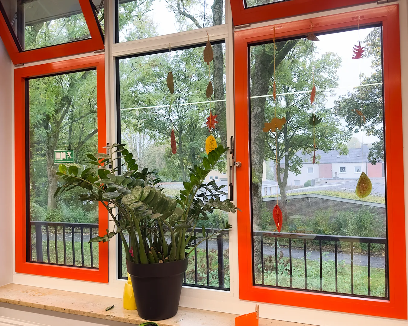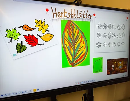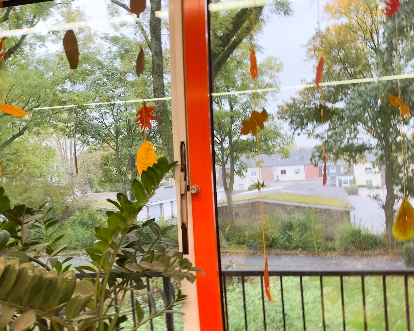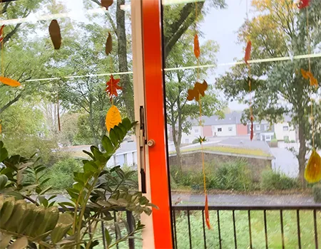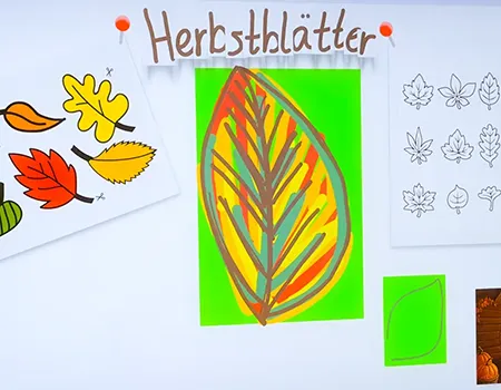 Die Kinder nutzten Gelb-, Grün-, Braun- und Rottöne und fädelten ihre Kunstwerke anschließend zu langen Girlanden auf. Das Festknoten an der Kordel war gar nicht so einfach - aber am Ende flatterten viele bunte Blätter vor dem Fenster und sorgten für herbstliche Stimmung.