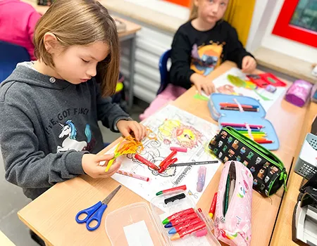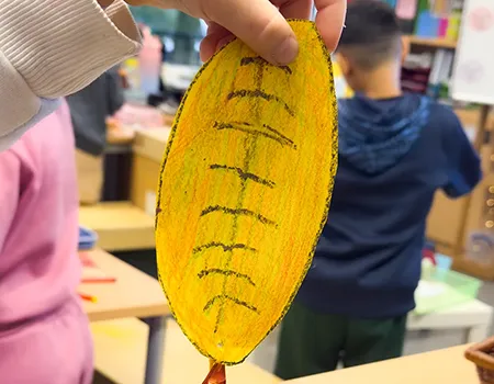 Schüler*innen bemalen Tonpapier und zeichnen Blattstrukturen auf.