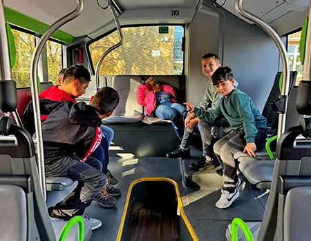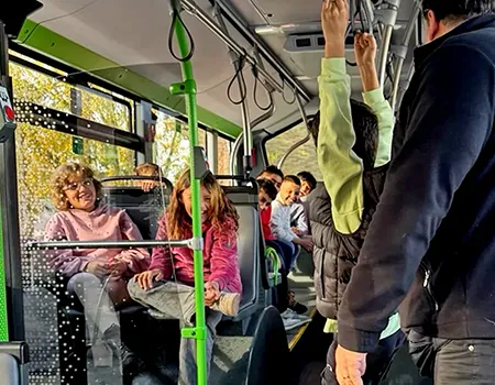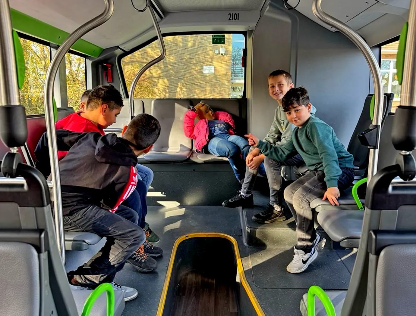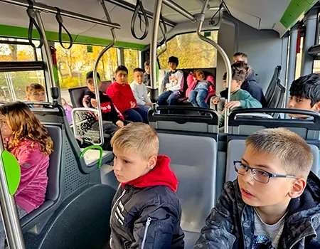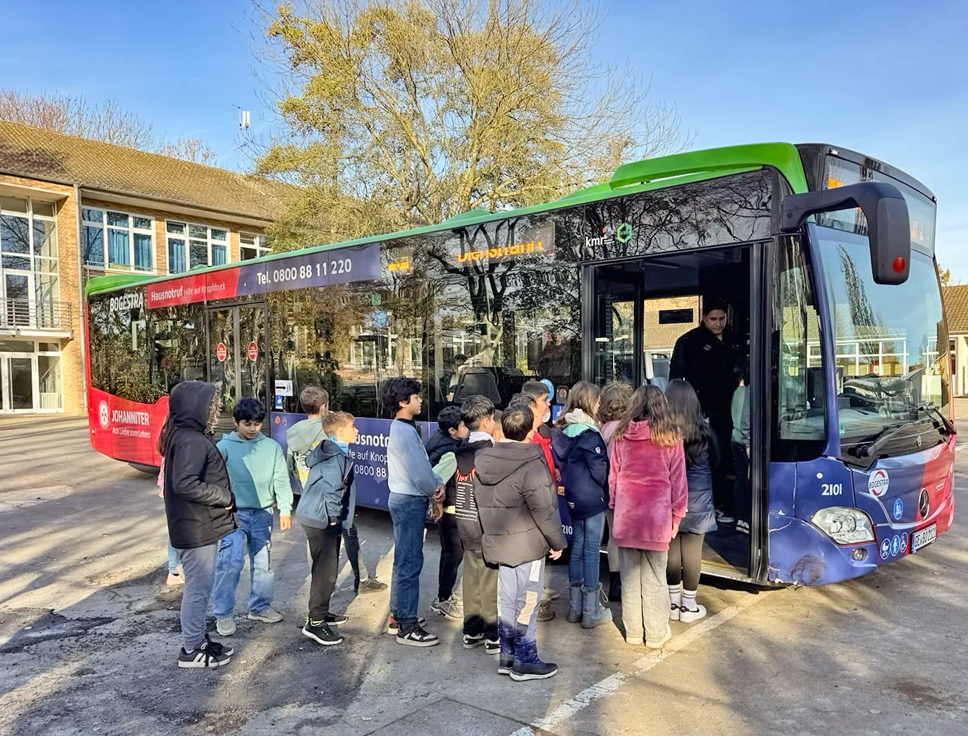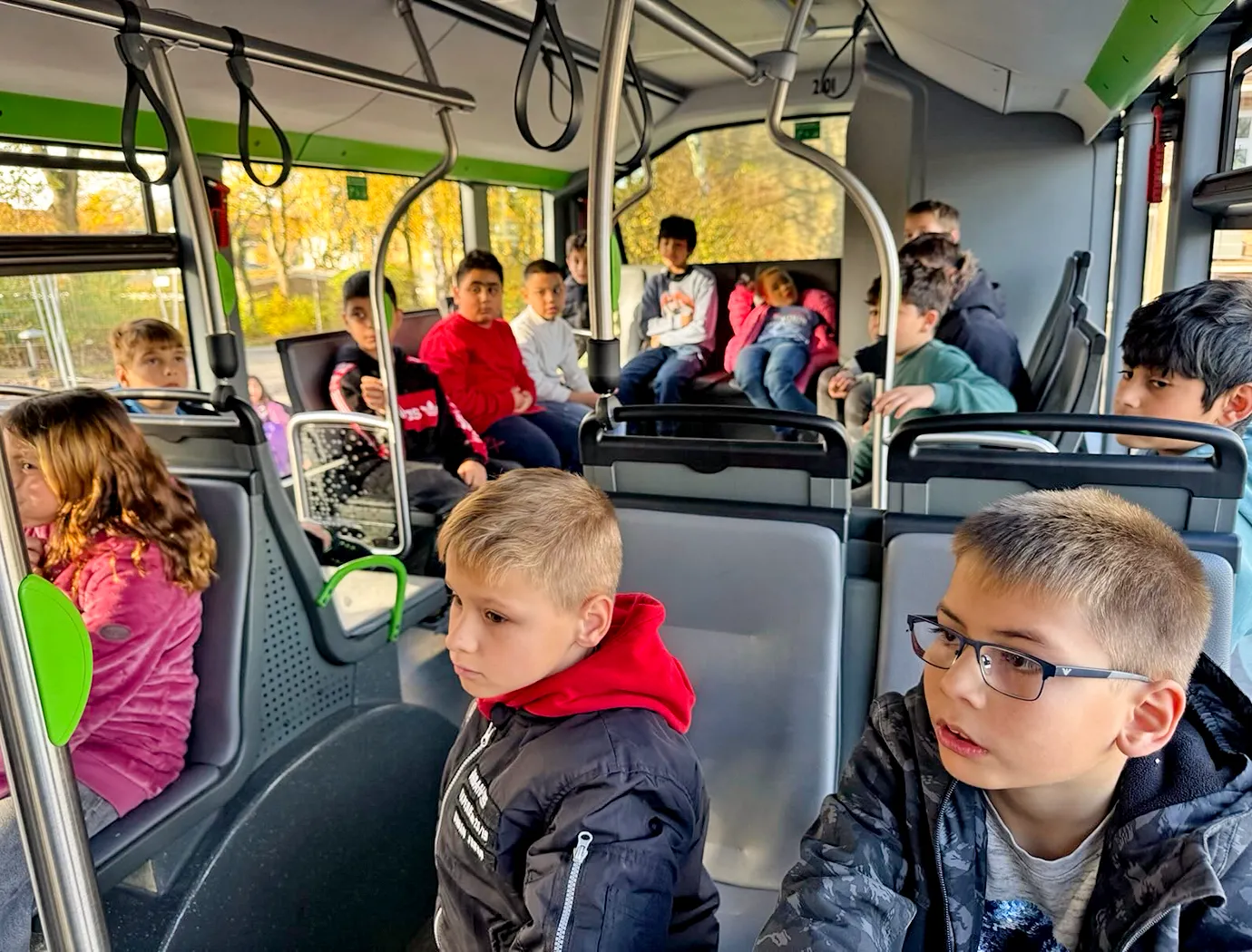Diese und noch hundert Fragen mehr konnten wir zusammen beim Besuch in der Busschule klären. Sehr anschaulich und pragmatisch haben wir uns dem Thema „Busfahren" gewidmet und alle Fragen nacheinander abgearbeitet. Zuerst gab es eine Theoriestunde im Klassenraum mit ganz grundlegenden Sachen: Haltestellen erkennen, Busfahrpläne lesen können, Schokotickets, das richtige Einsteigen in den Bus und das richtige Verhalten während der Busfahrt.
