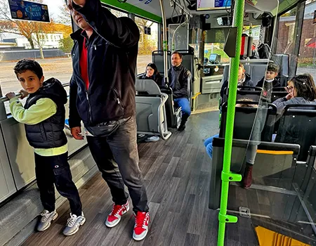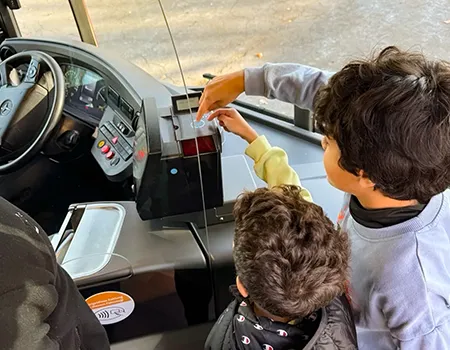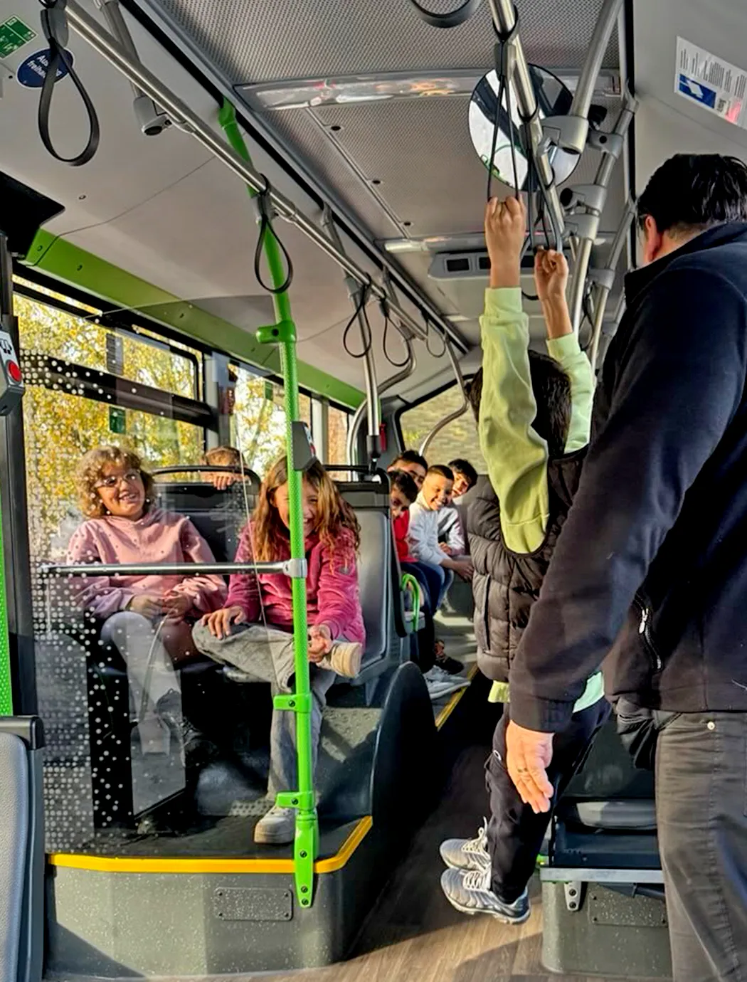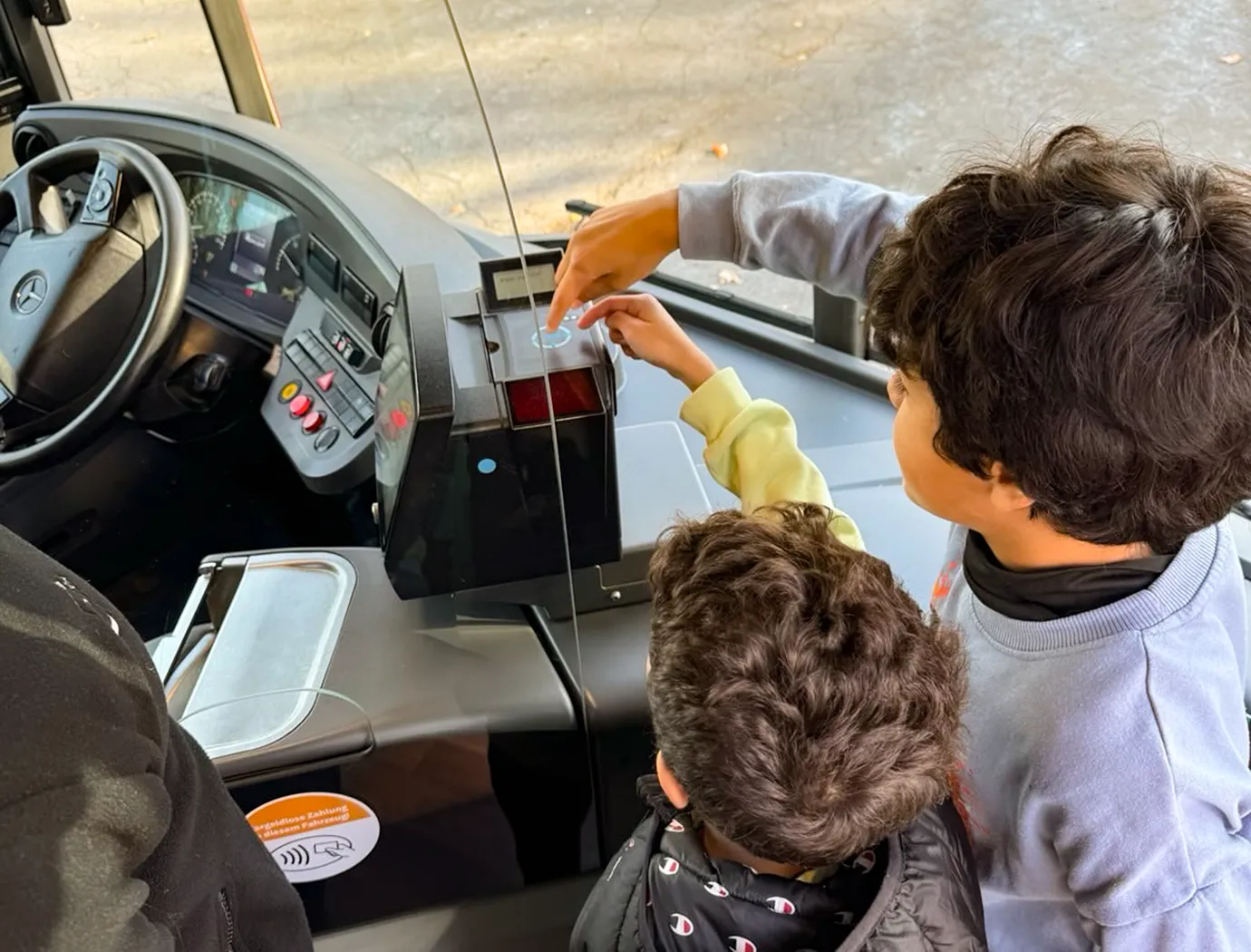 Und dann ging's in den Bus. Dort konnten wir unser neuerworbenes Wissen gleich mal in die Tat umsetzen und schauen, wie das alles funktioniert: beim Einstieg das Ticket an die richtige Stelle halten, Festhalteschaufen vermeiden, wenn man noch nicht groß genug dafür ist (das kommt noch, ganz sicher!). Wo man mit Tornistern gut sitzen kann und wie man sie hinstellt, dass andere trotzdem noch dran vorbeikommen, wenn man sie absetzt. Im Bus wurde den Kindern gezeigt, wo sie einen sicheren Platz finden, wo sie gut gesehen werden und sich auch gut festhalten können. Und auch, was sie machen können, wenn sie Hilfe brauchen (Immer dem Busfahrer Bescheid sagen).