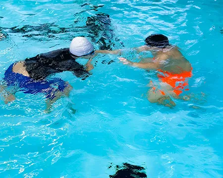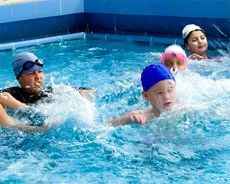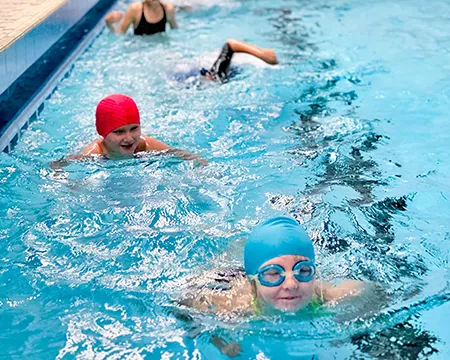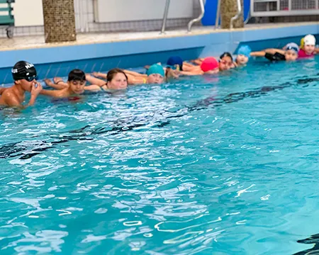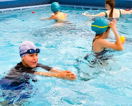 Schüler*innen schwimmen im Lehrschwimmbecken der Schule, spielen Spiele im Wasser und hören der Sportlehrerin bei ihren Anweisungen zu.