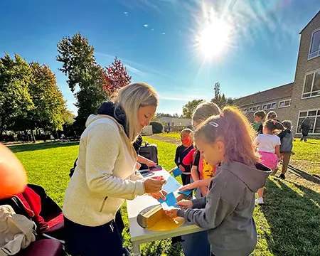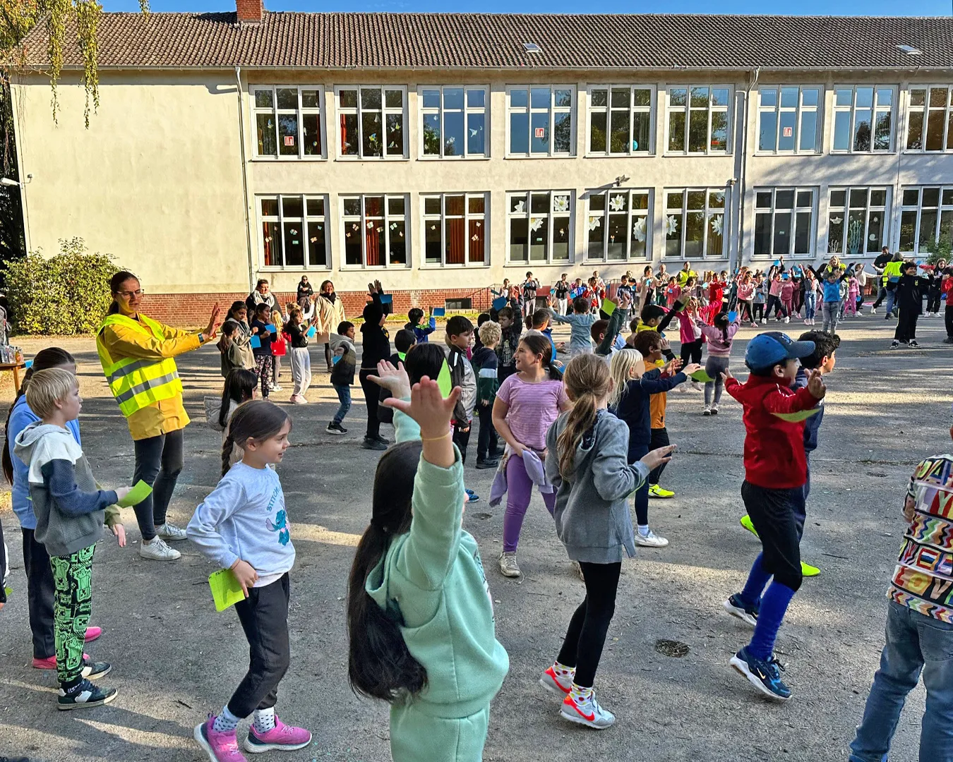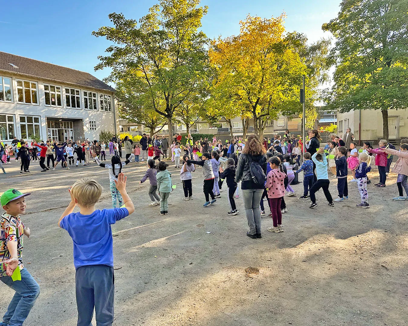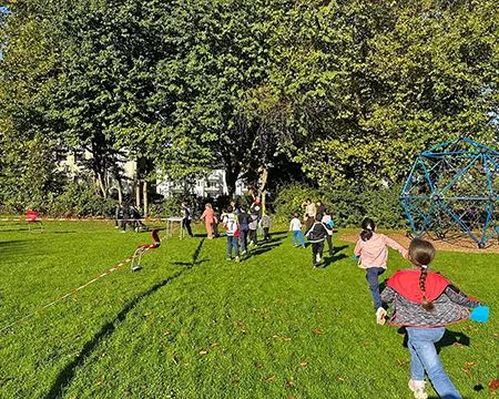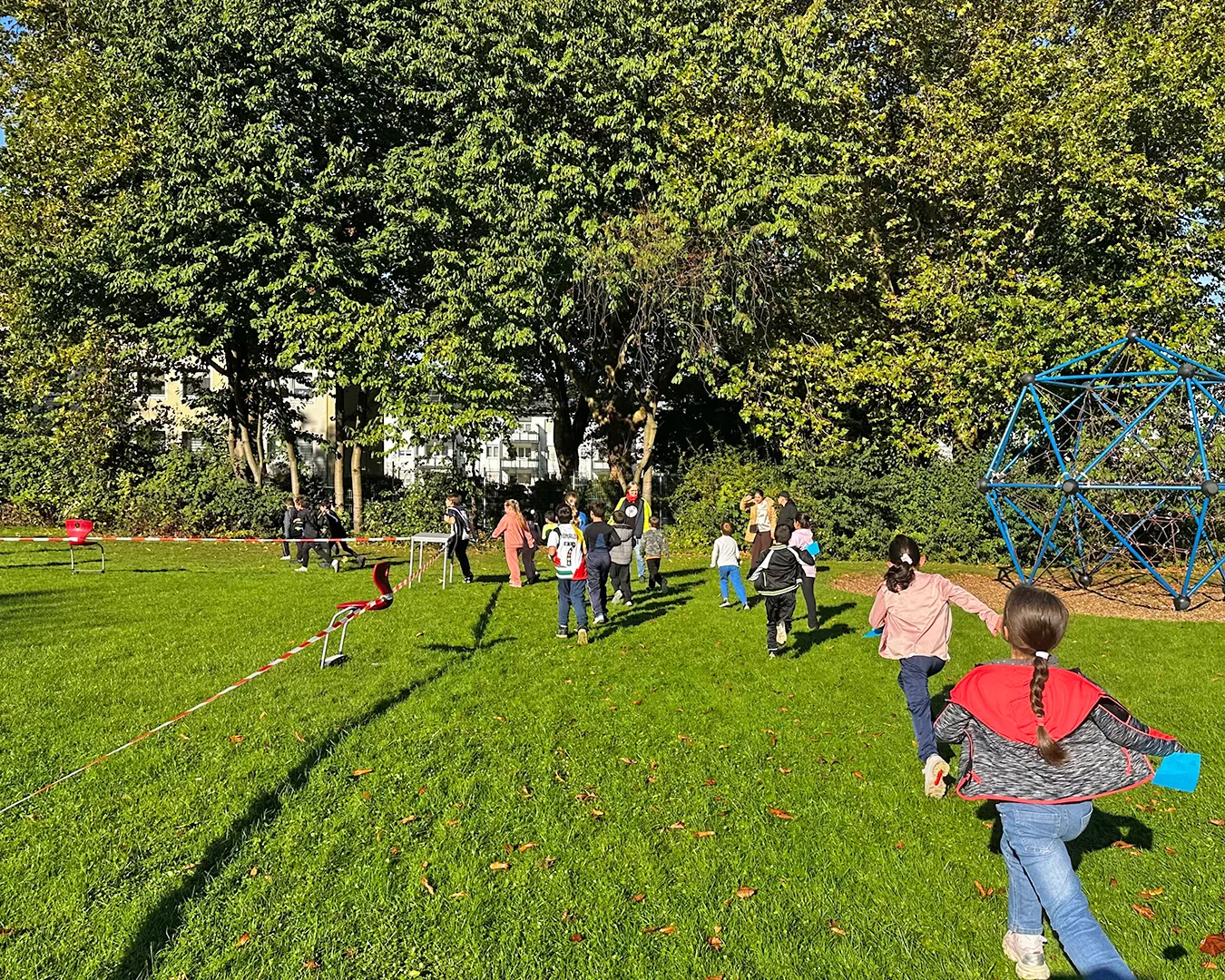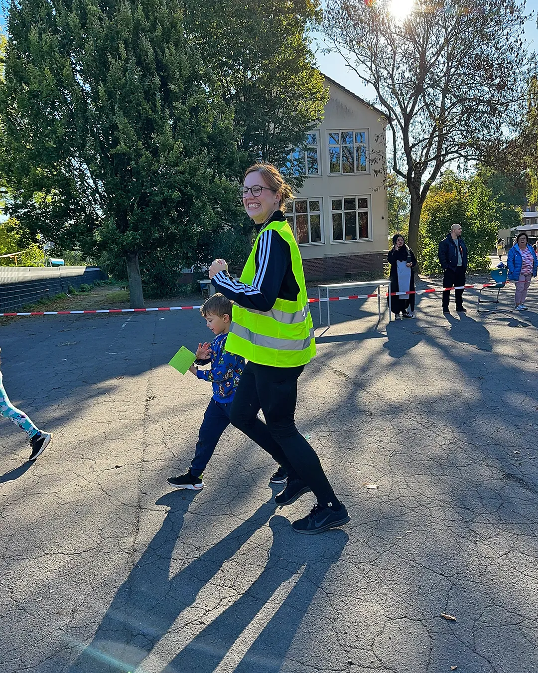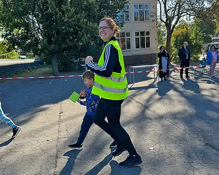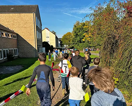 Schüler*innen laufen auf dem Schulgelände einen vorgesteckten Parccours ab.