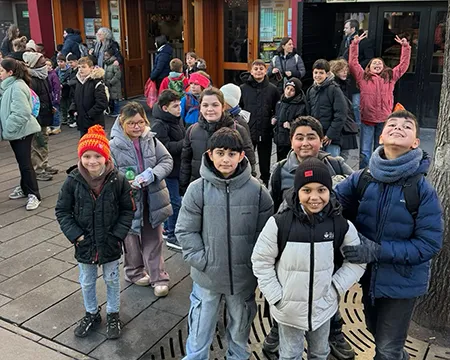 Schüler*innen auf dem Weg zum Kino, vor dem Kino und im Kinosaal.