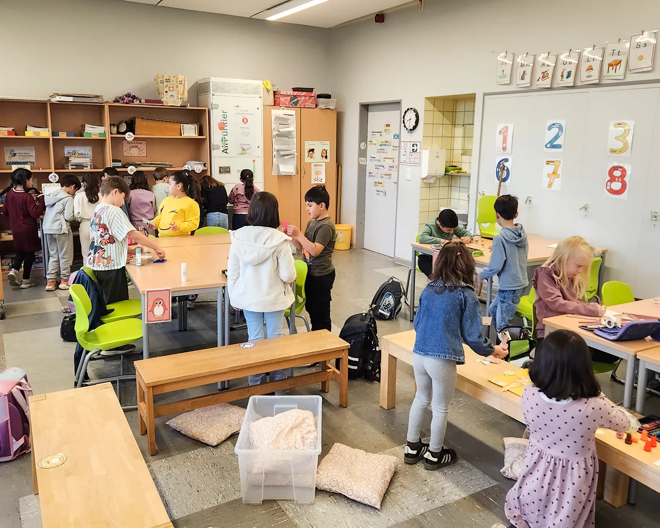 Schüler*innen arbeiten im Klassenraum an den einzelnen Stationen.