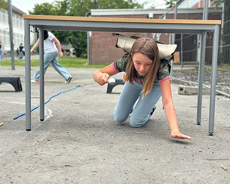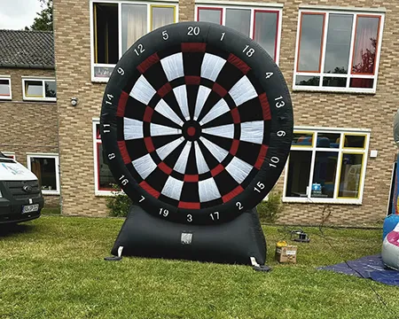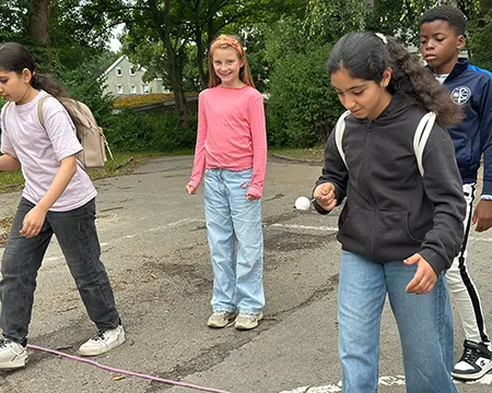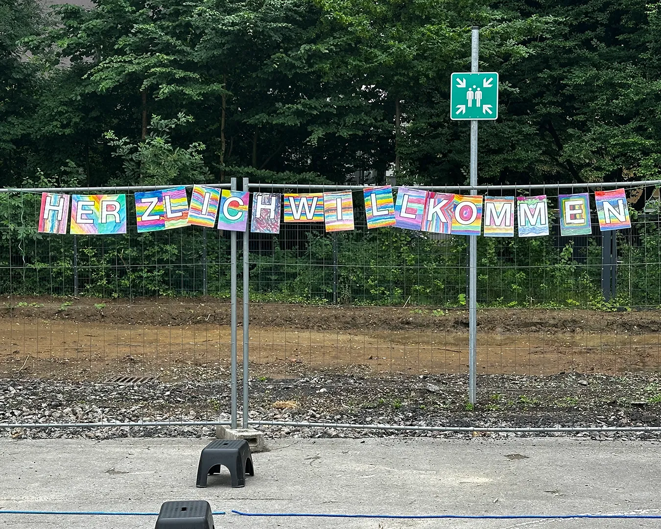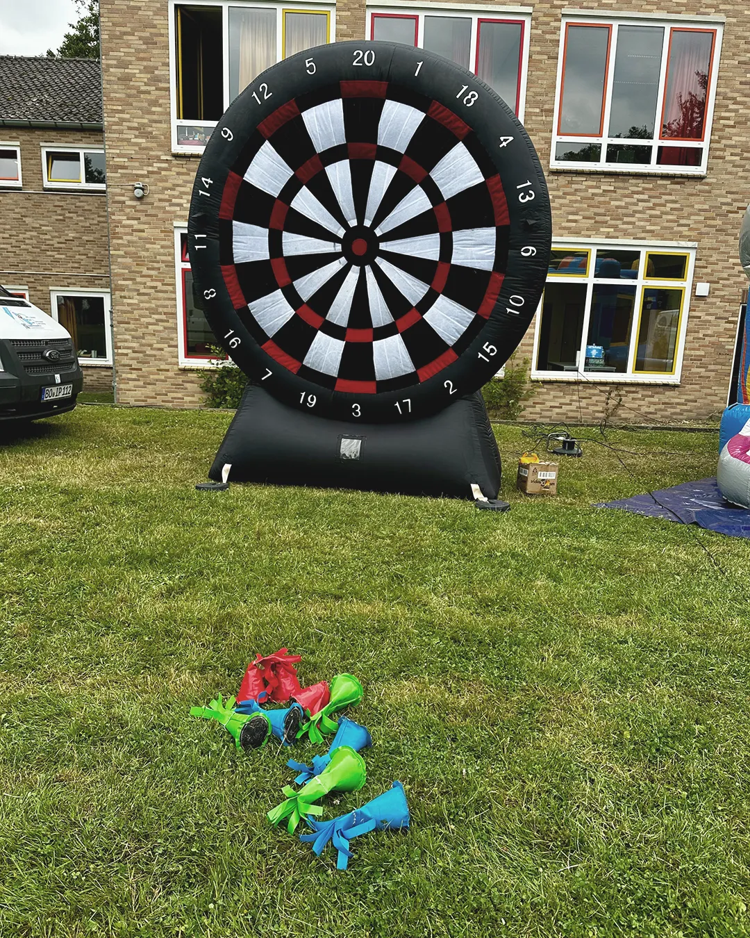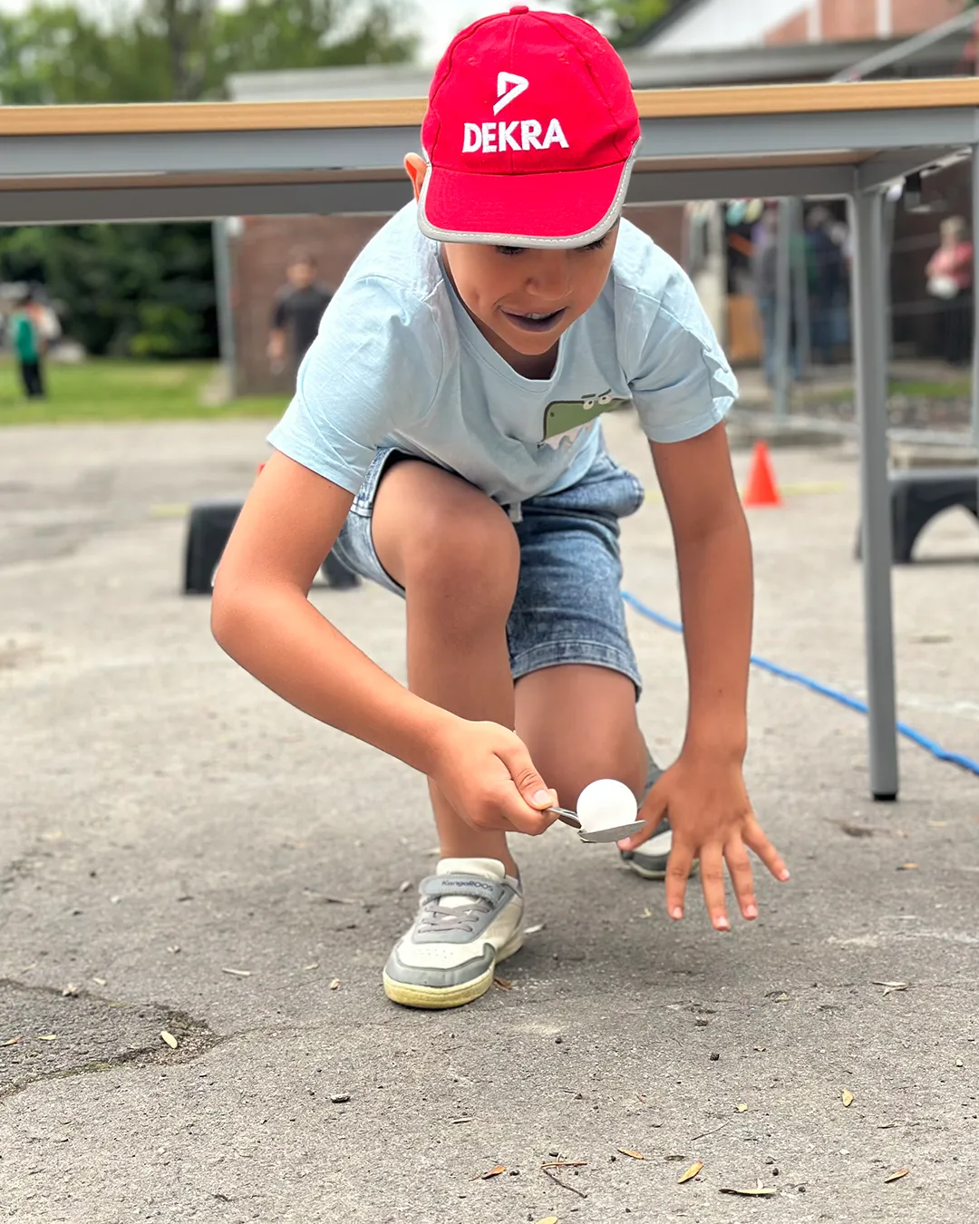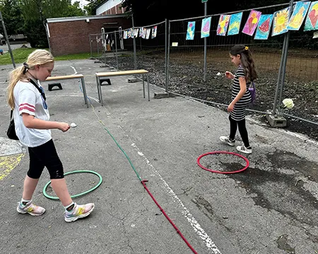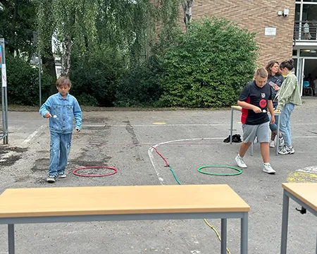 Schüler*innen, Eltern und Lehrkräfte gehen auf dem Schulhof der Emil-von-Behringschule verschiedenen Aktivitäten nach. Eine Riesendartscheibe ist abgebildet. Viele der Kinder machen beim Eierlaufwettbewerb mit. Es gibt auch Bastelangebote.