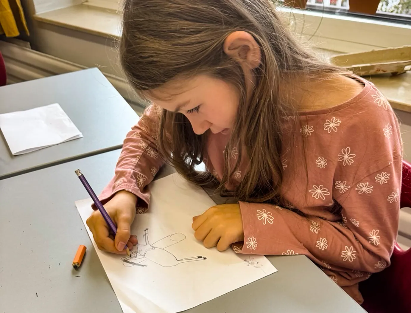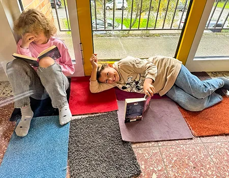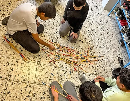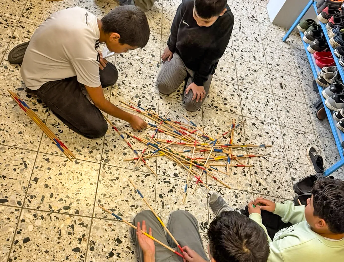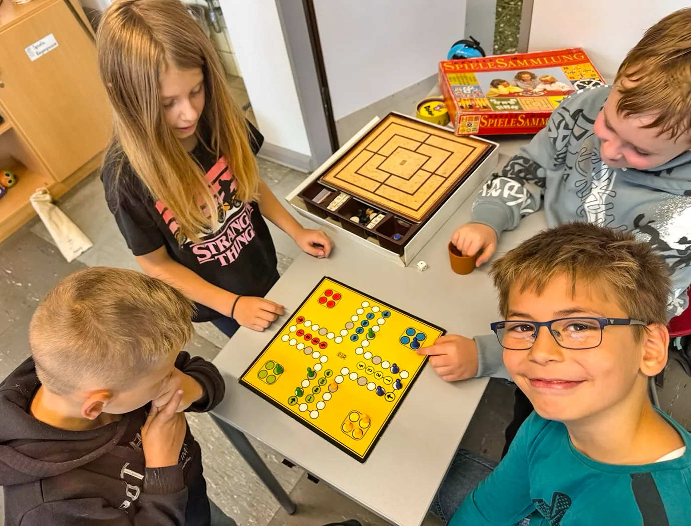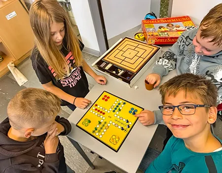 Schüler*innen spielen gemeinsame Spiele im Klassenraum und auf dem Flur.