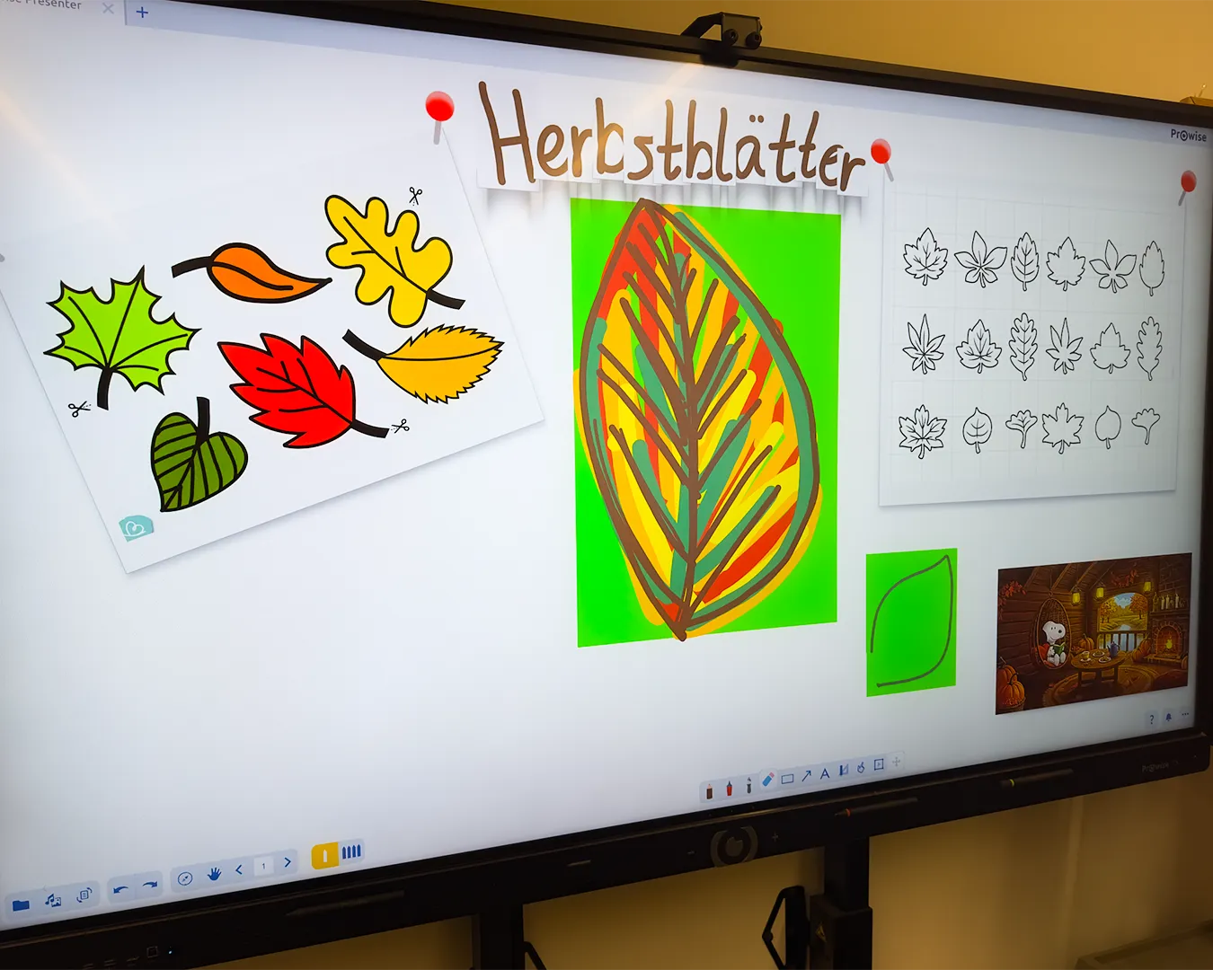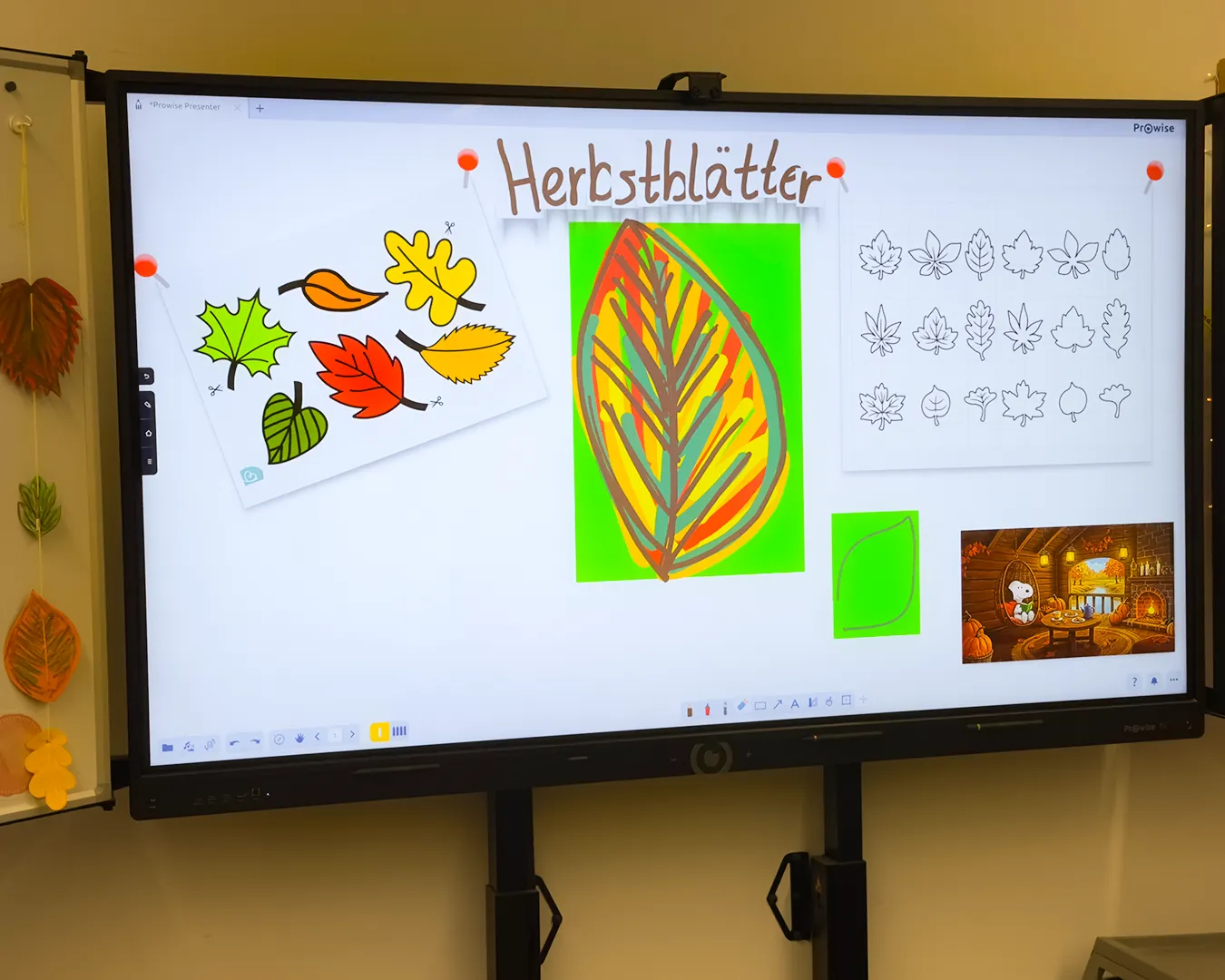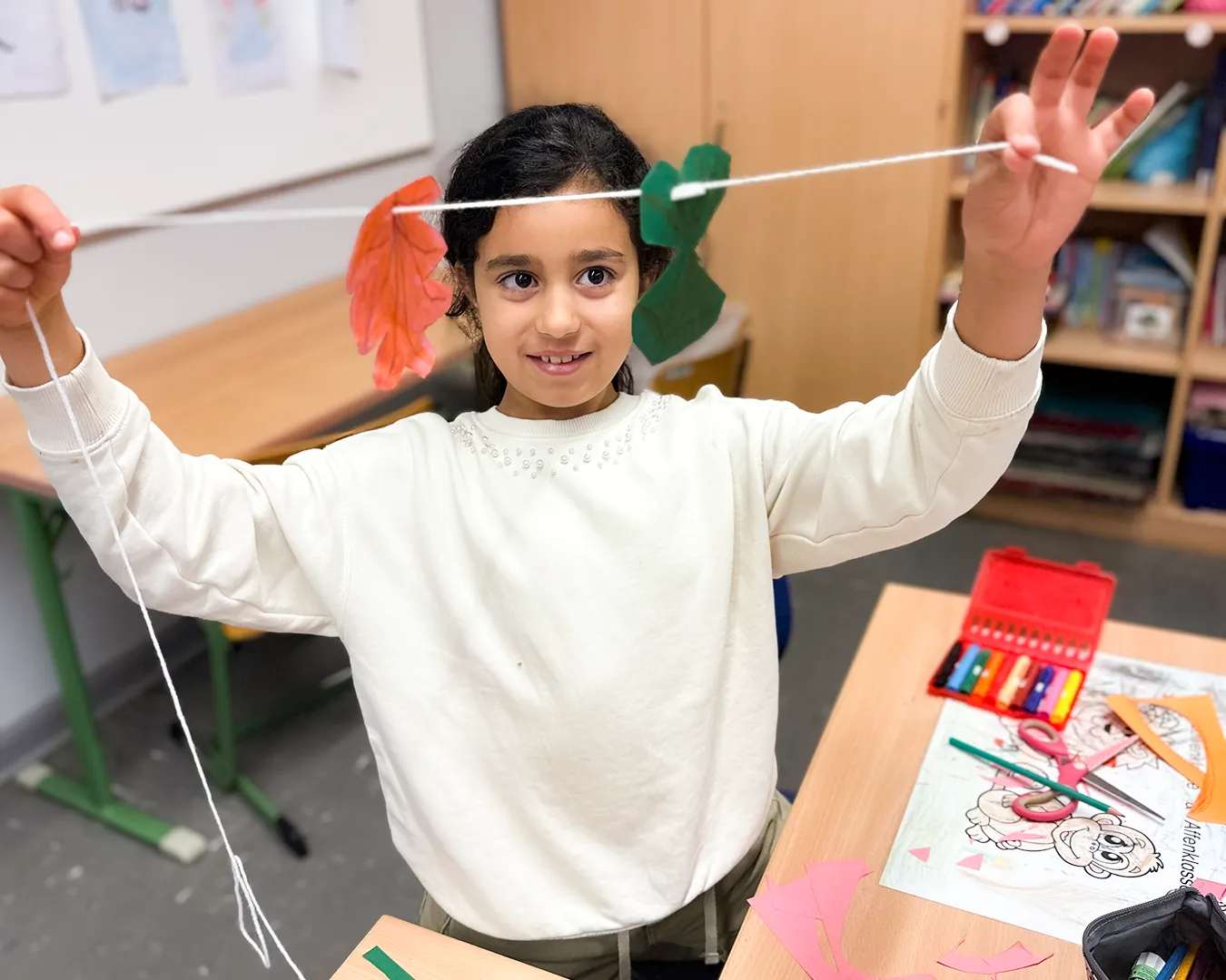 Die Kinder nutzten Gelb-, Grün-, Braun- und Rottöne und fädelten ihre Kunstwerke anschließend zu langen Girlanden auf. Das Festknoten an der Kordel war gar nicht so einfach - aber am Ende flatterten viele bunte Blätter vor dem Fenster und sorgten für herbstliche Stimmung.