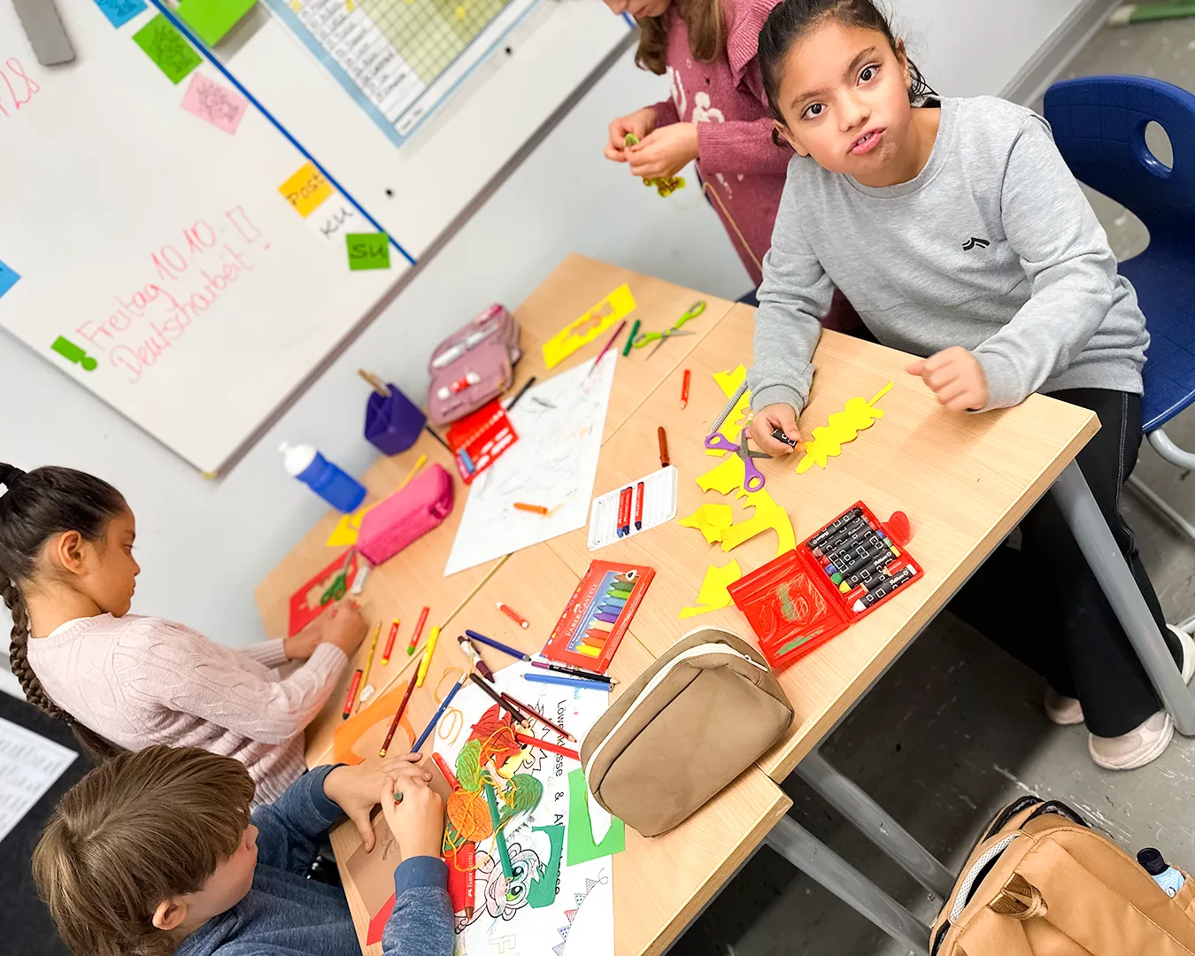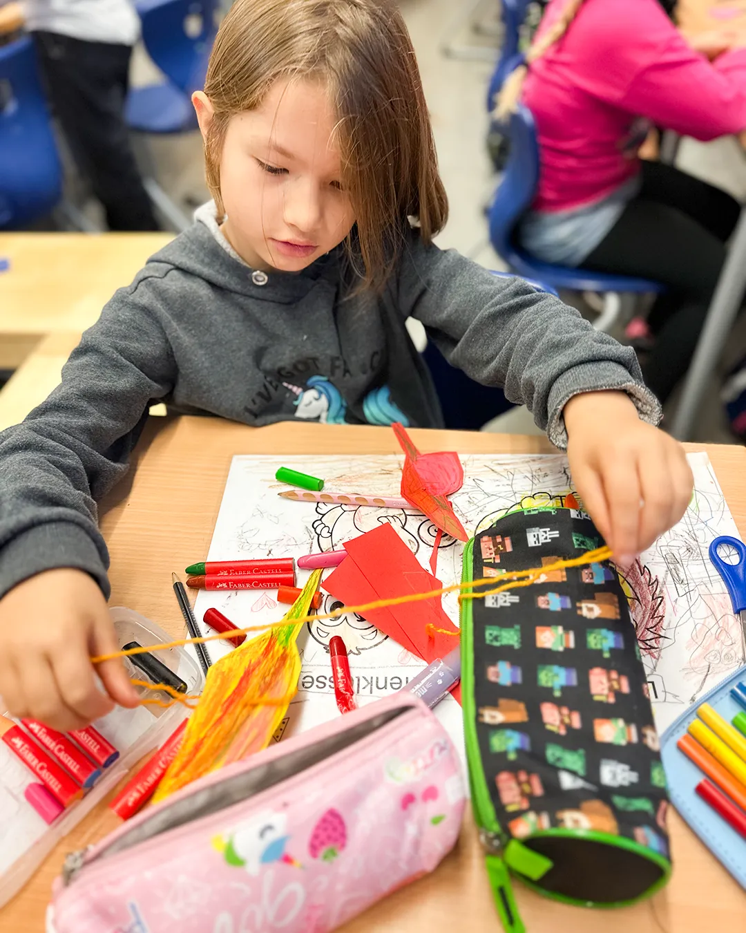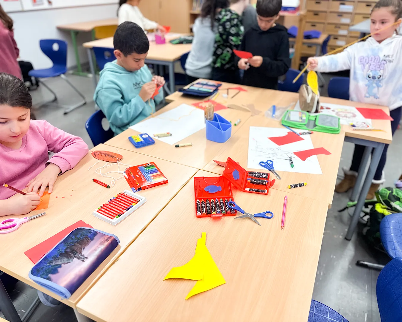 Die Kinder nutzten Gelb-, Grün-, Braun- und Rottöne und fädelten ihre Kunstwerke anschließend zu langen Girlanden auf. Das Festknoten an der Kordel war gar nicht so einfach - aber am Ende flatterten viele bunte Blätter vor dem Fenster und sorgten für herbstliche Stimmung.