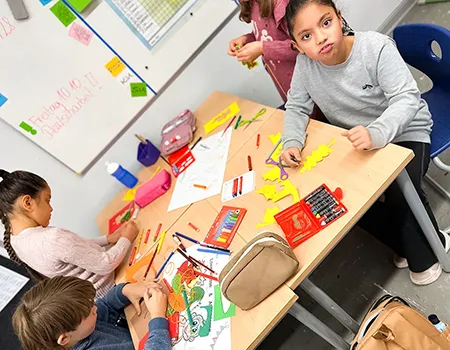 Schüler*innen bemalen Tonpapier und zeichnen Blattstrukturen auf.