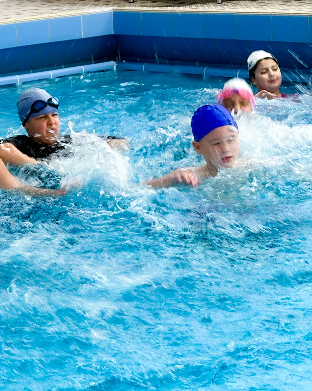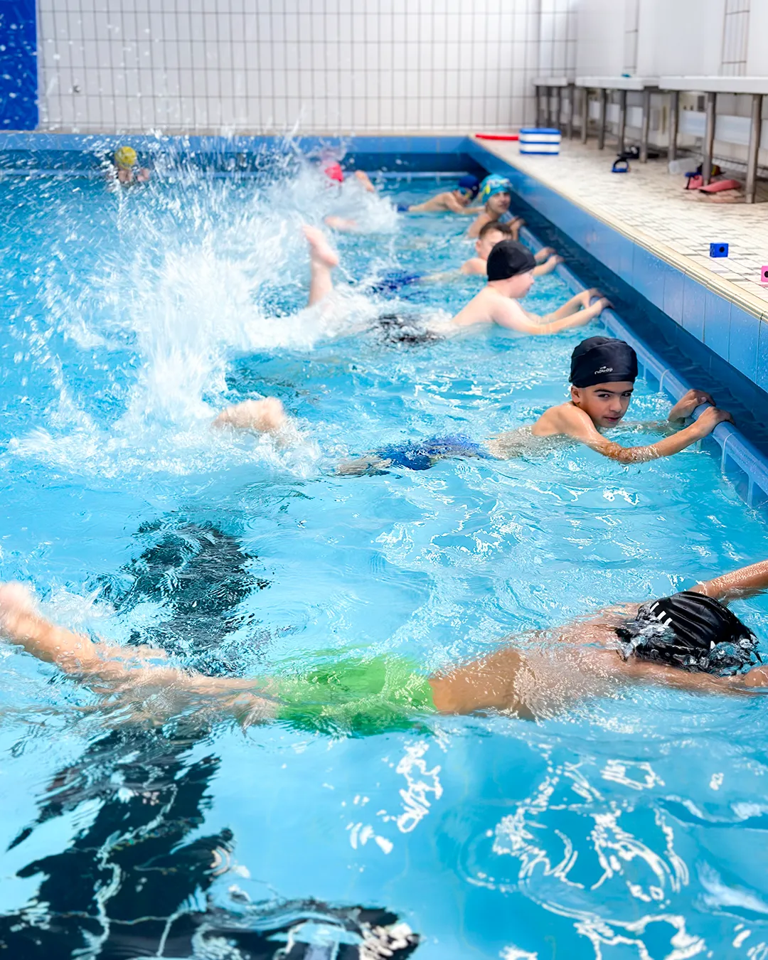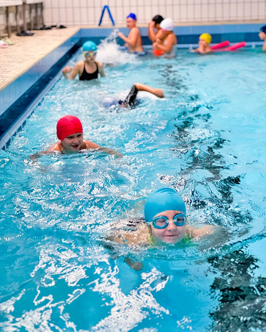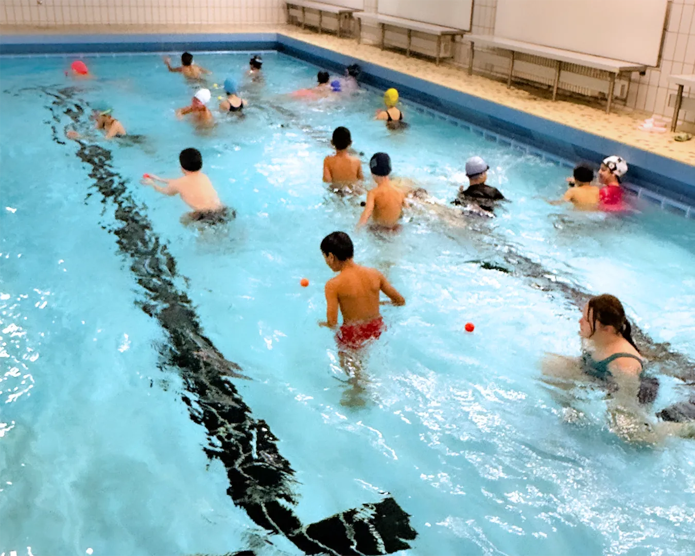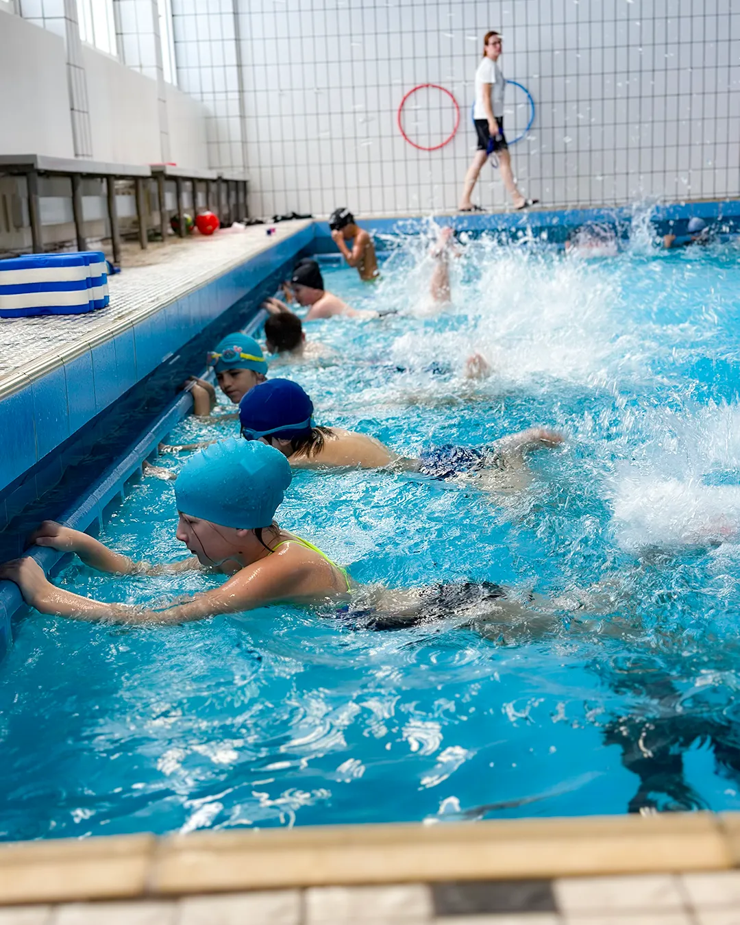 Schüler*innen schwimmen im Lehrschwimmbecken der Schule, spielen Spiele im Wasser und hören der Sportlehrerin bei ihren Anweisungen zu.