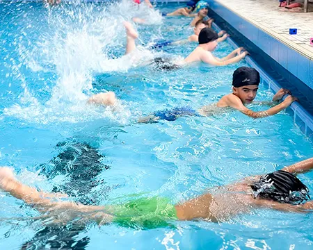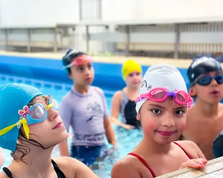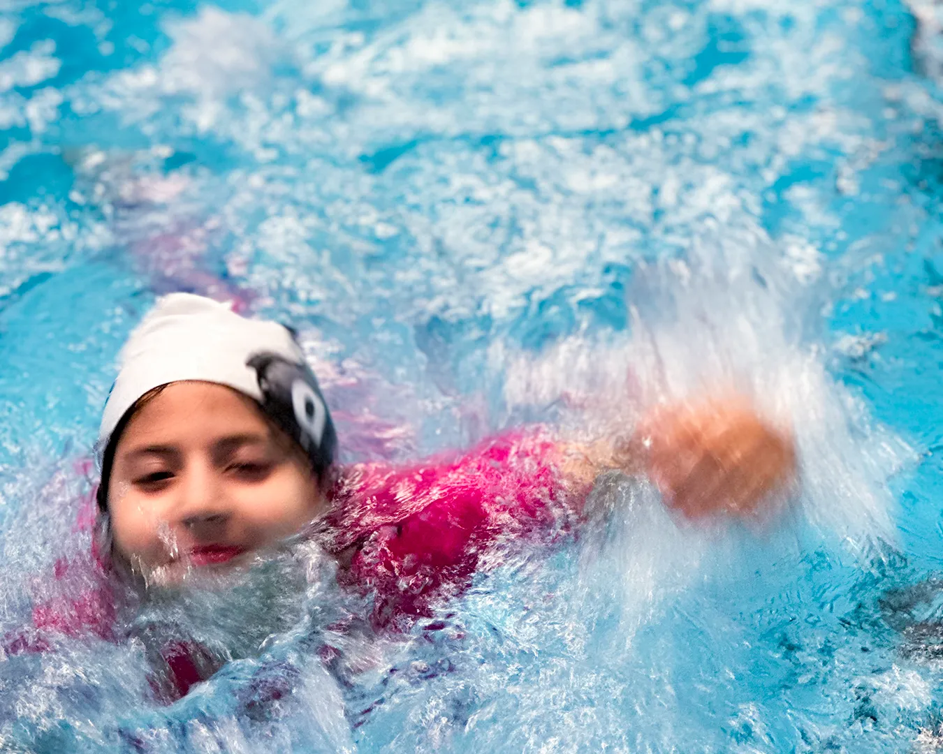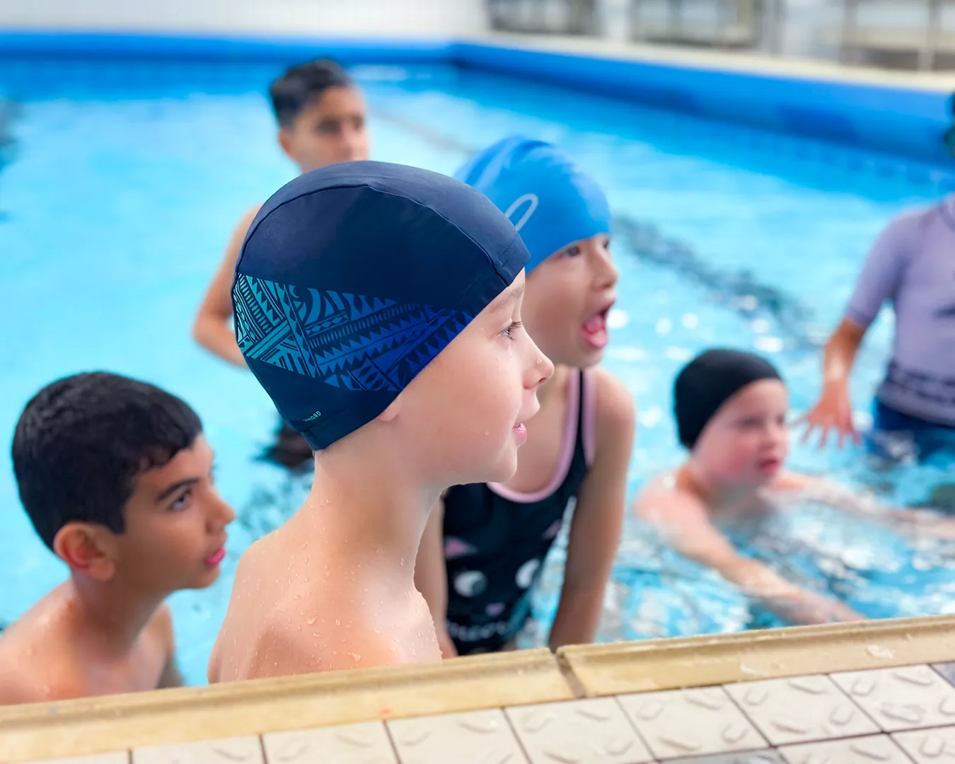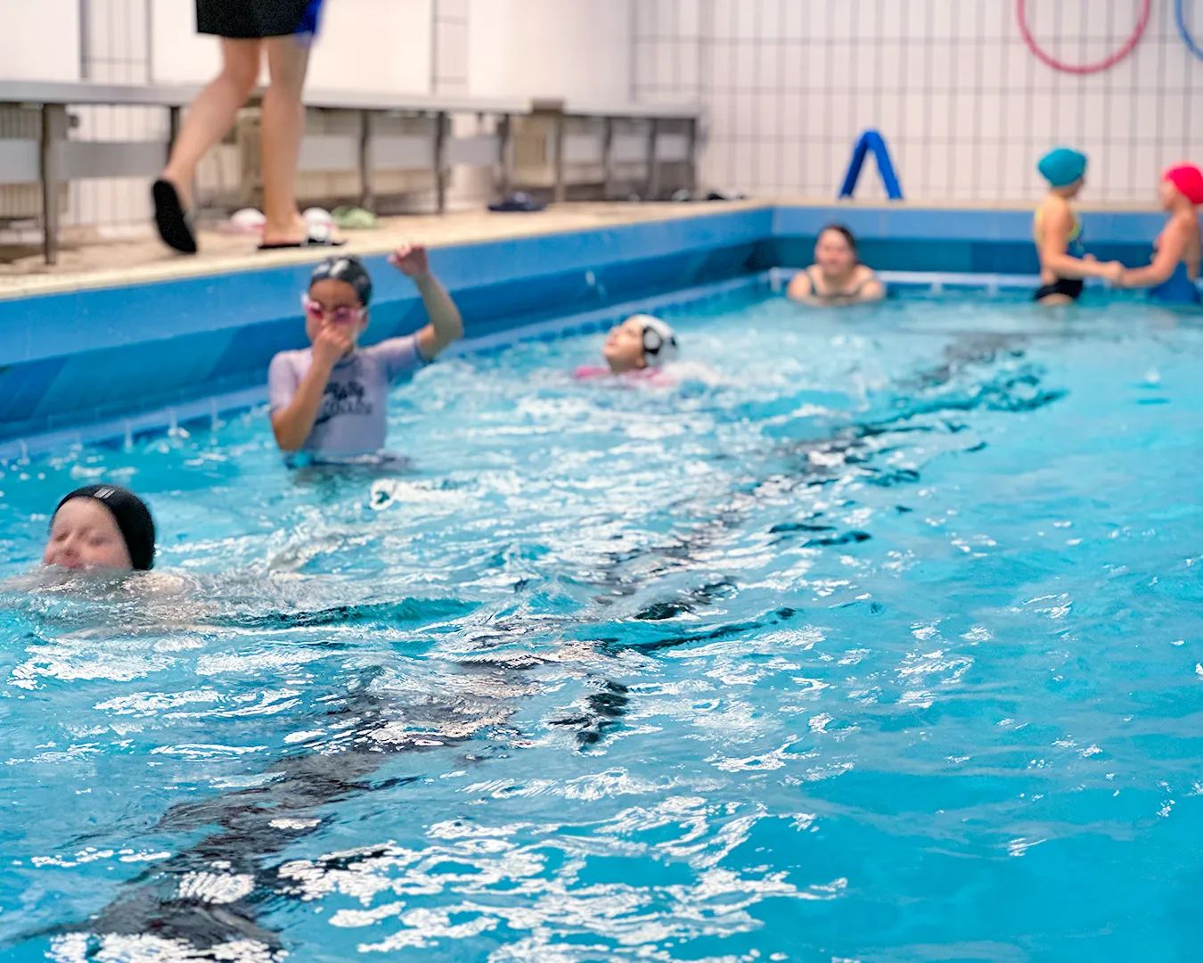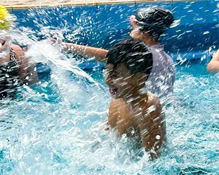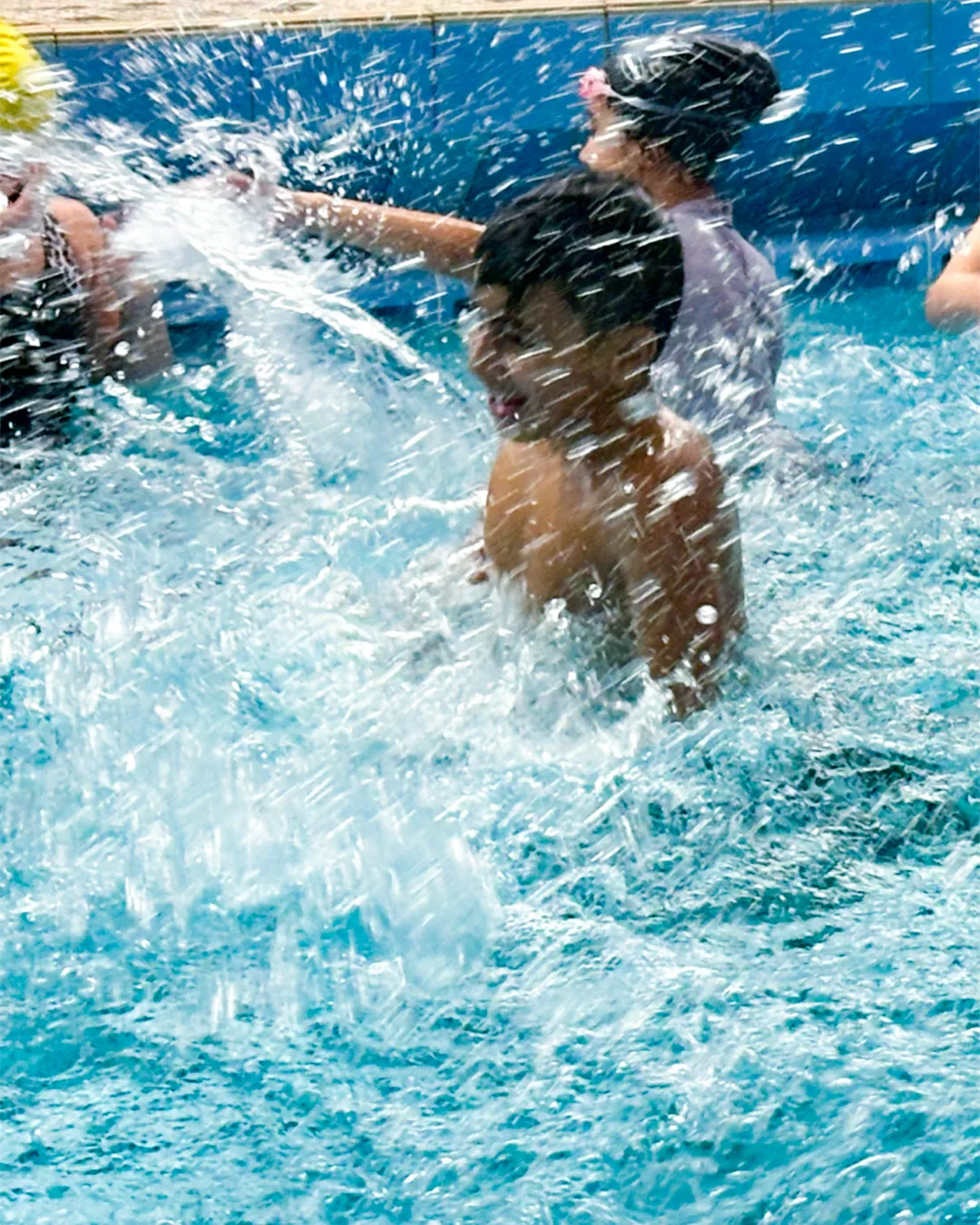 Schüler*innen schwimmen im Lehrschwimmbecken der Schule, spielen Spiele im Wasser und hören der Sportlehrerin bei ihren Anweisungen zu.