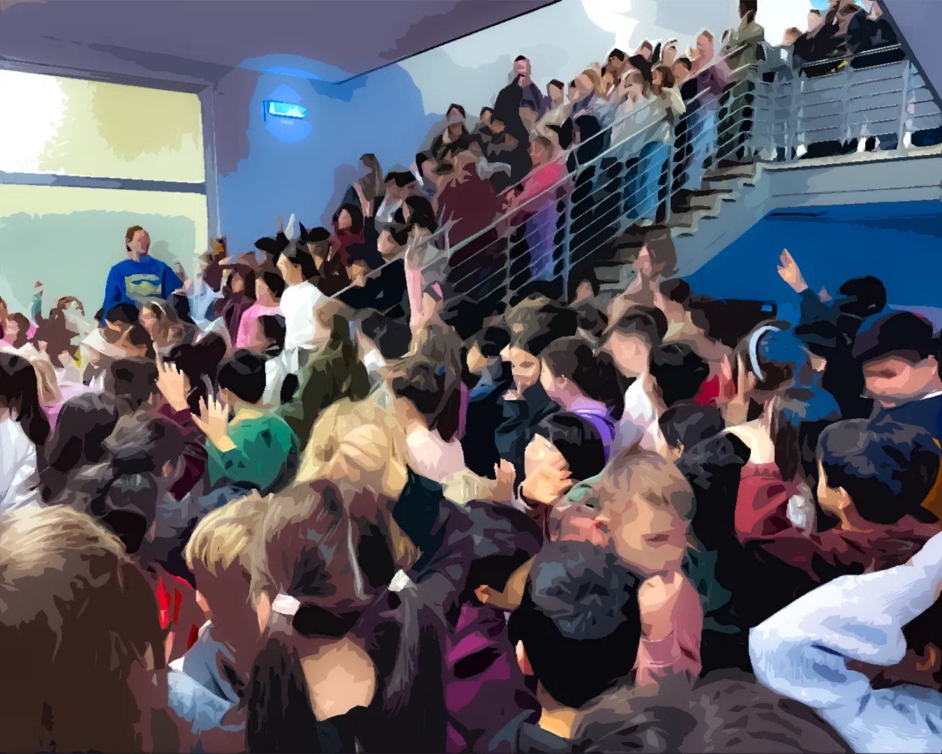 Schüler*innen und Lehrkräfte singen in der Eingangshalle Adventslieder