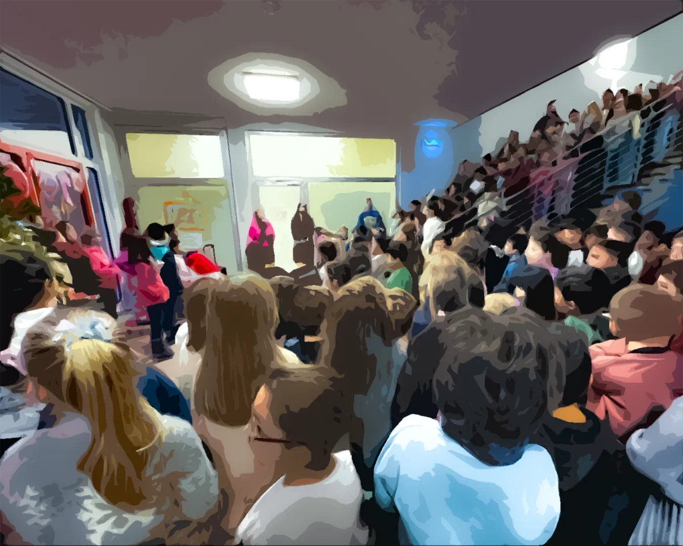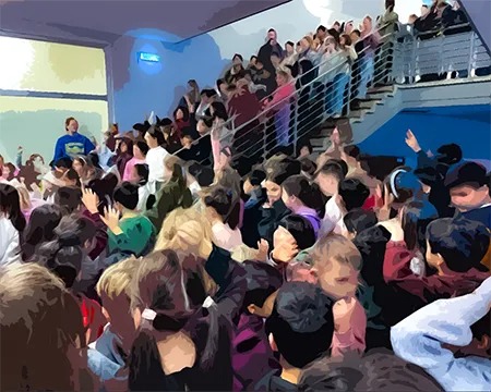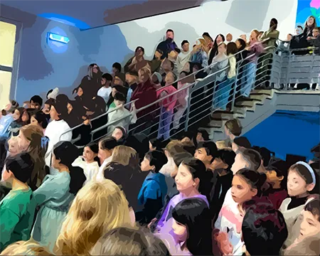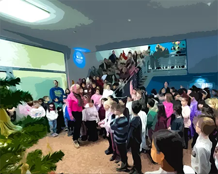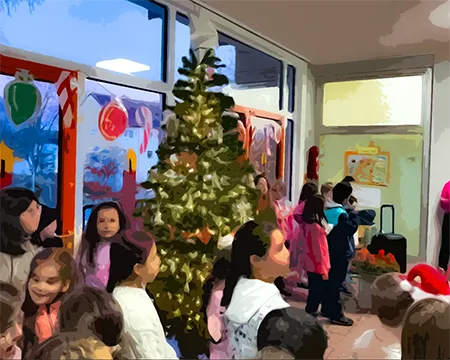 Alle Kinder der Schule versammelten sich gemeinsam mit dem Schulteam vor dem großen, geschmückten Tannenbaum in der Eingangshalle, um Adventslieder zu singen.