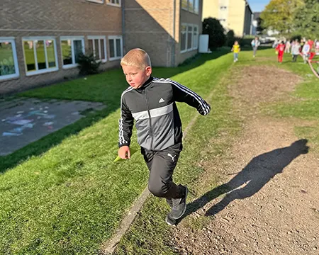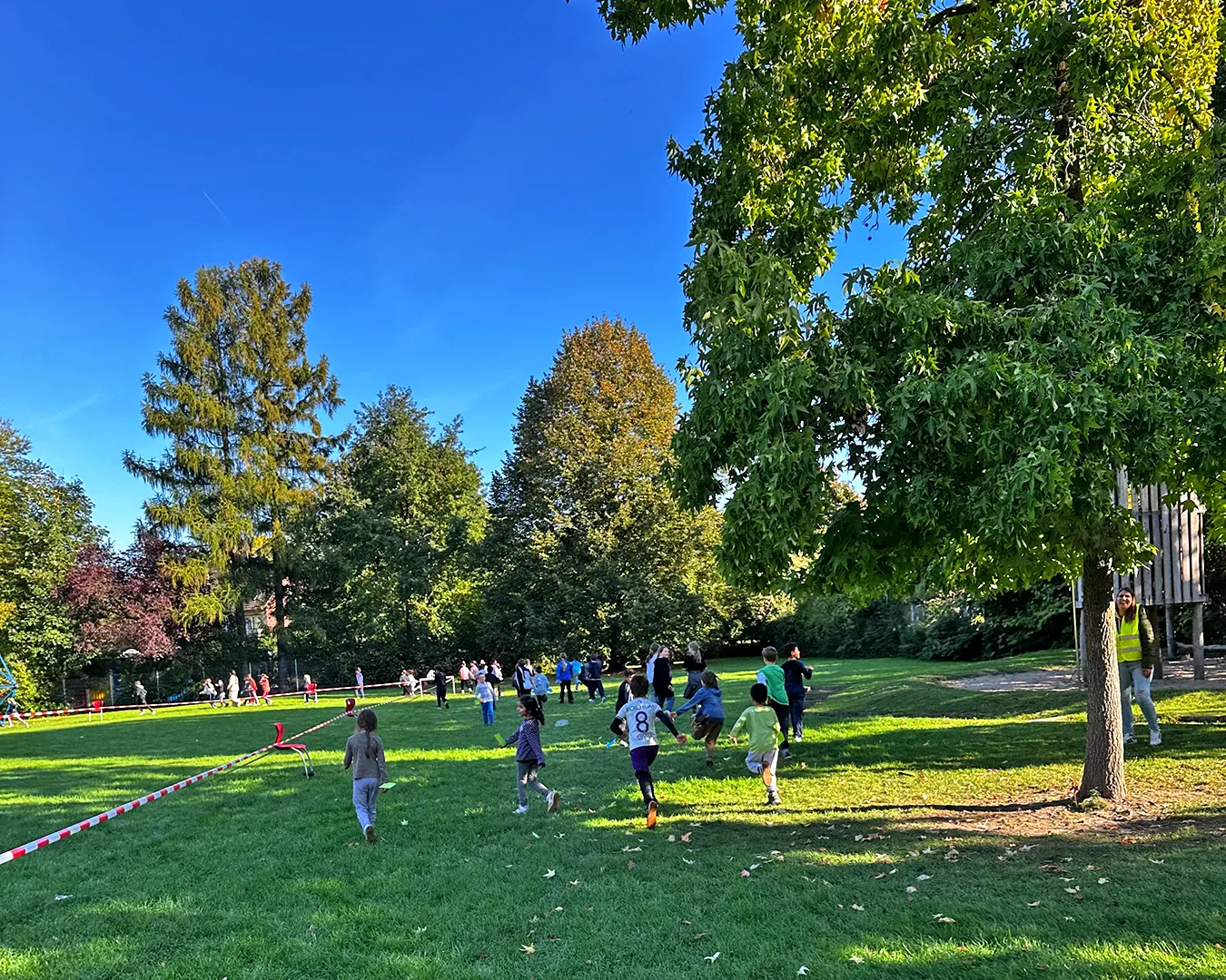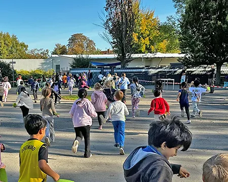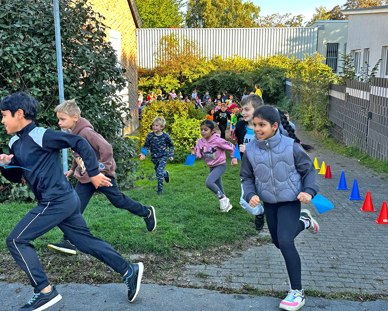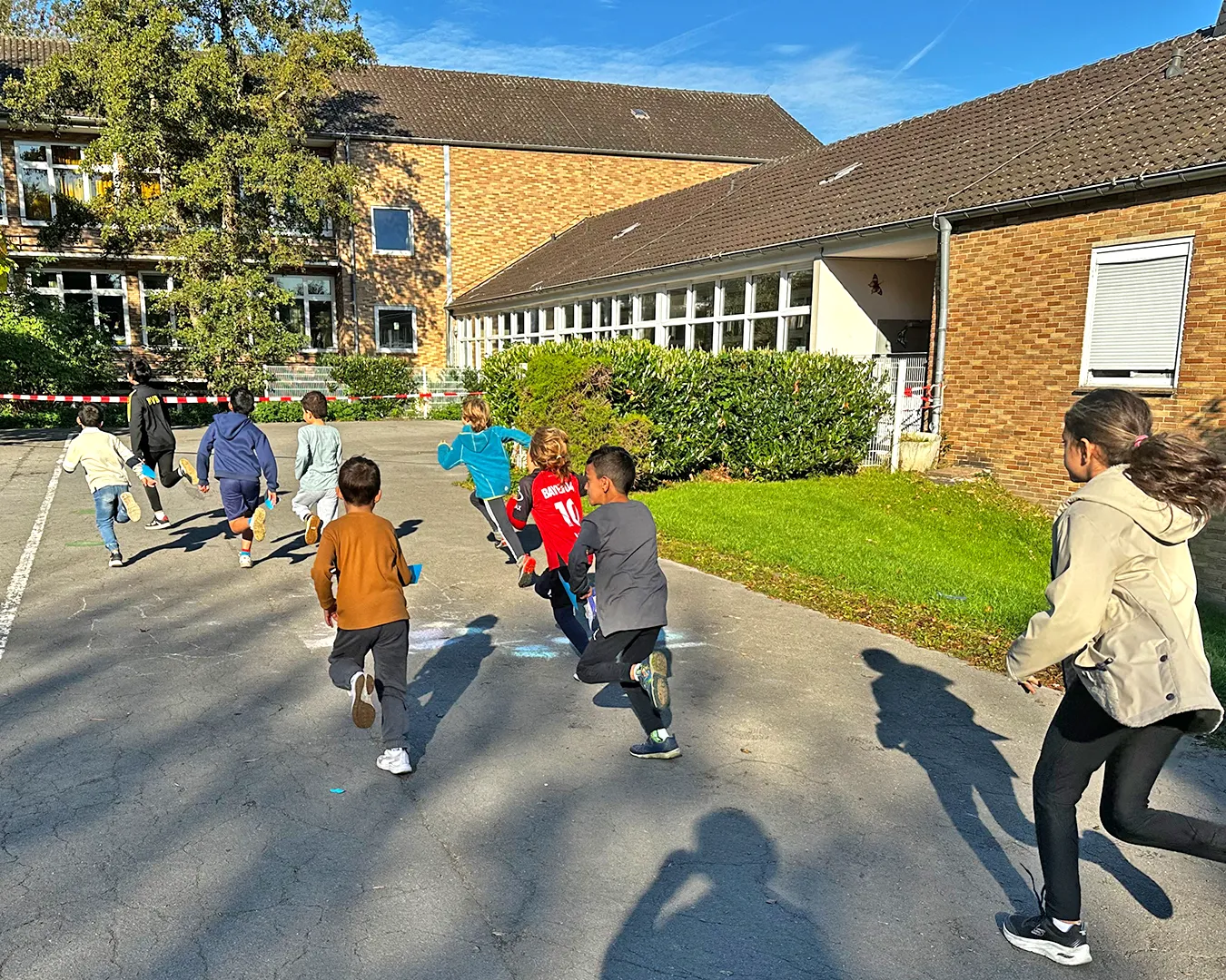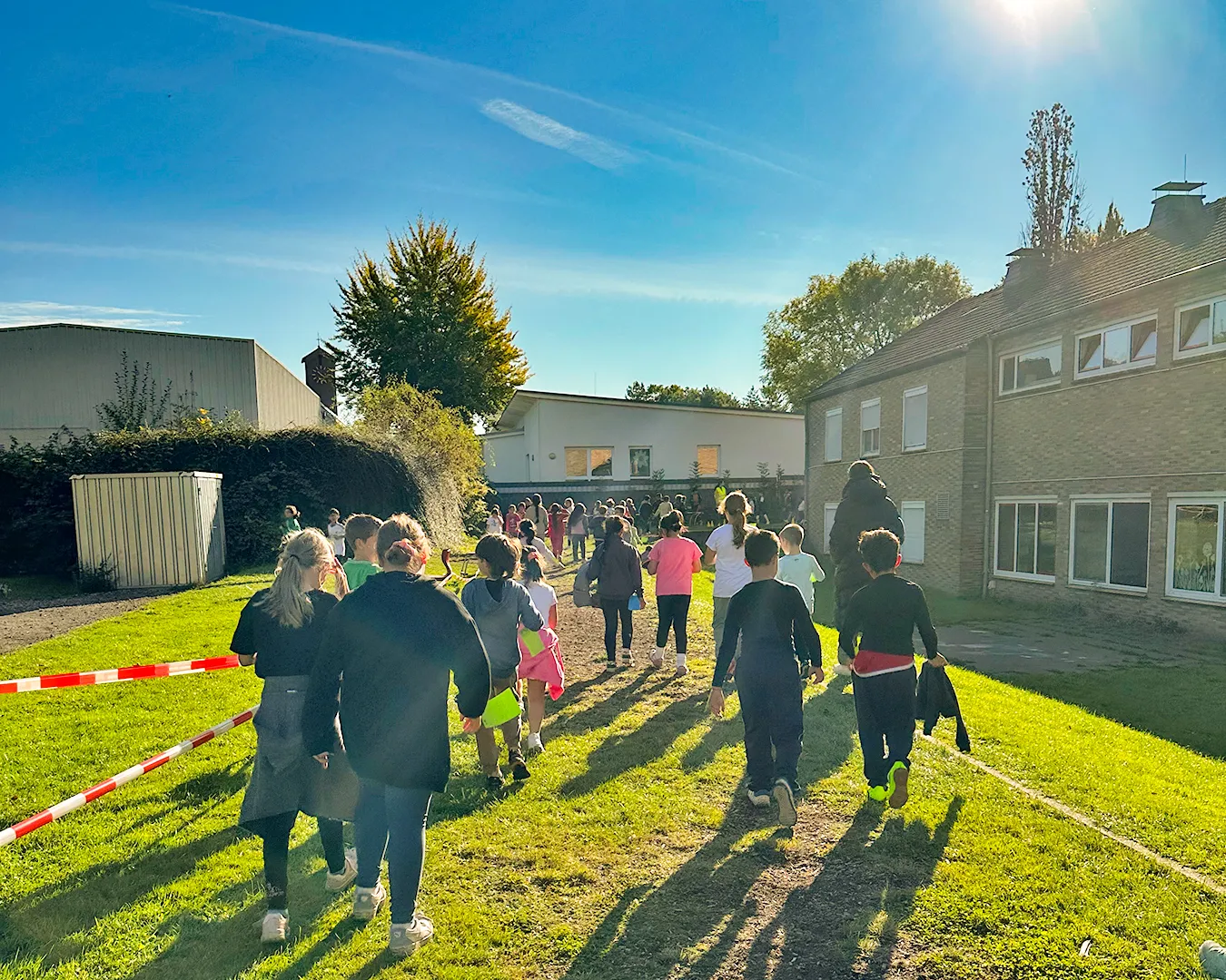 Schüler*innen laufen auf dem Schulgelände einen vorgesteckten Parccours ab.