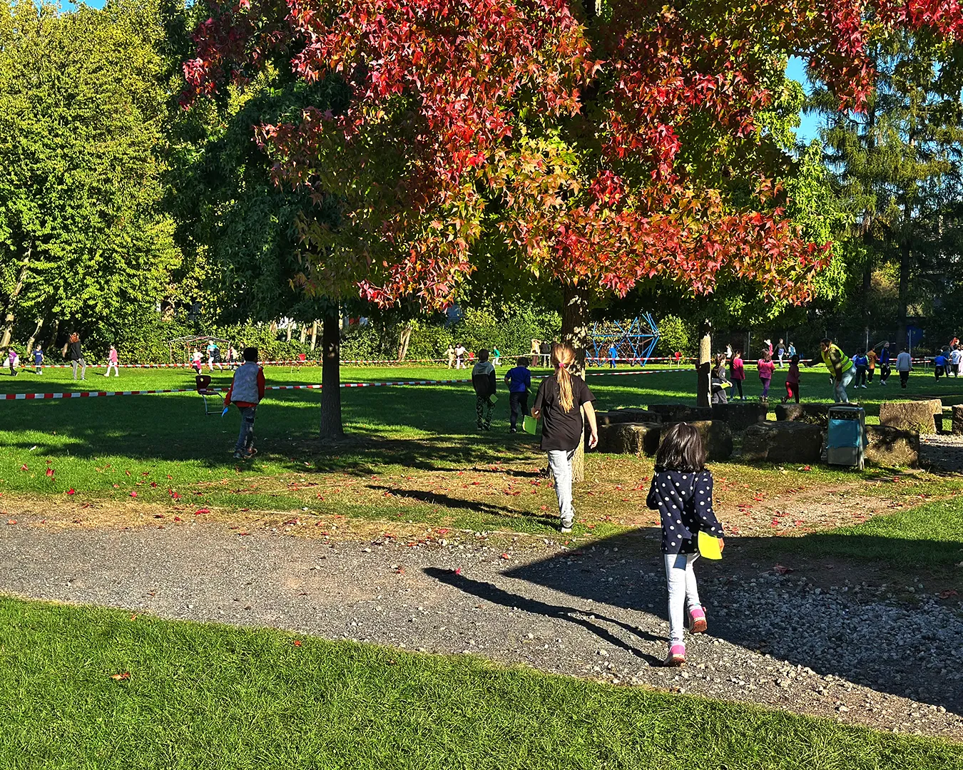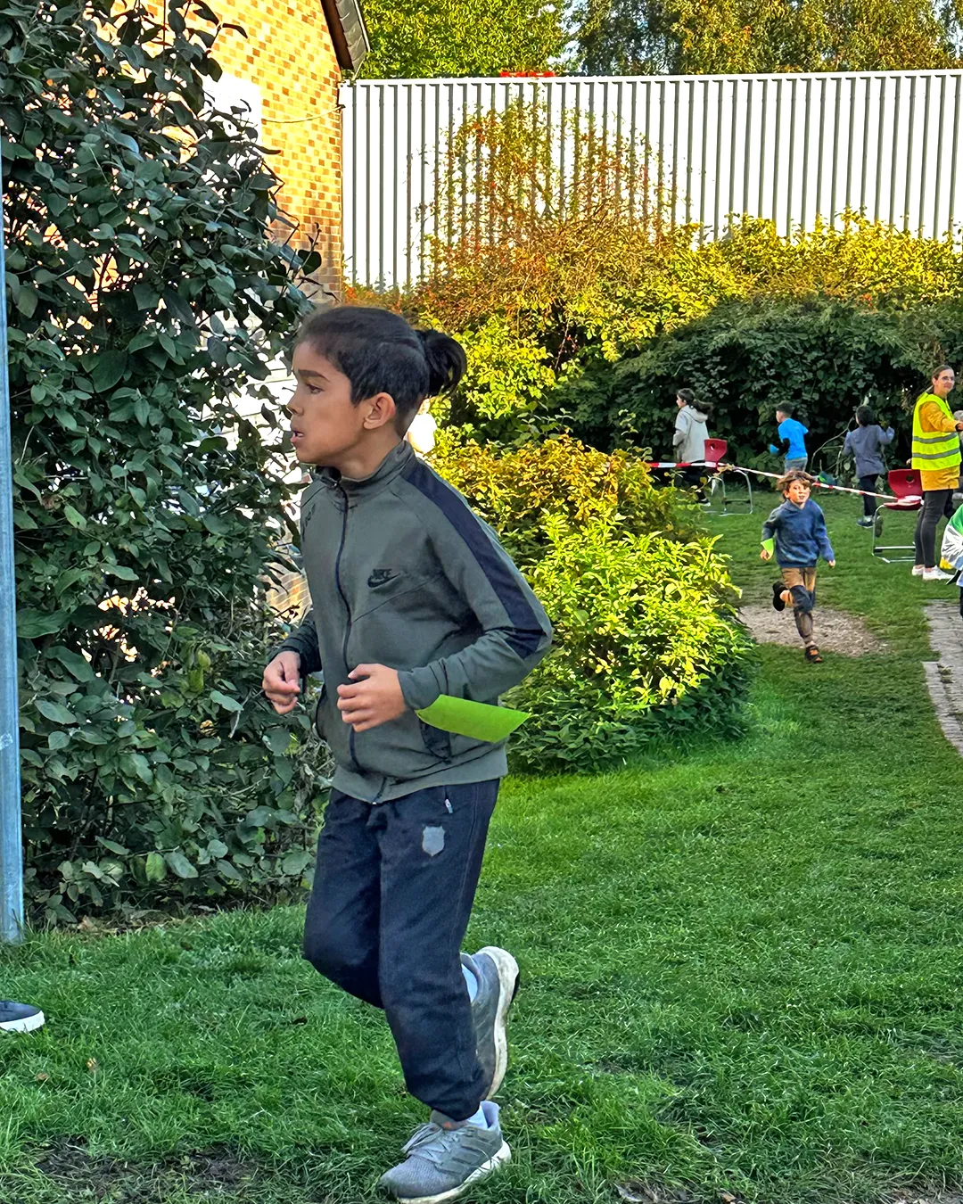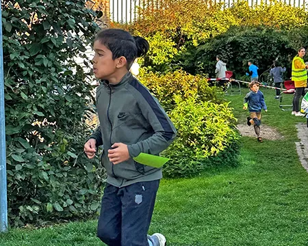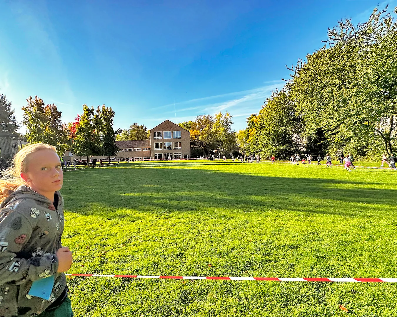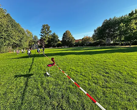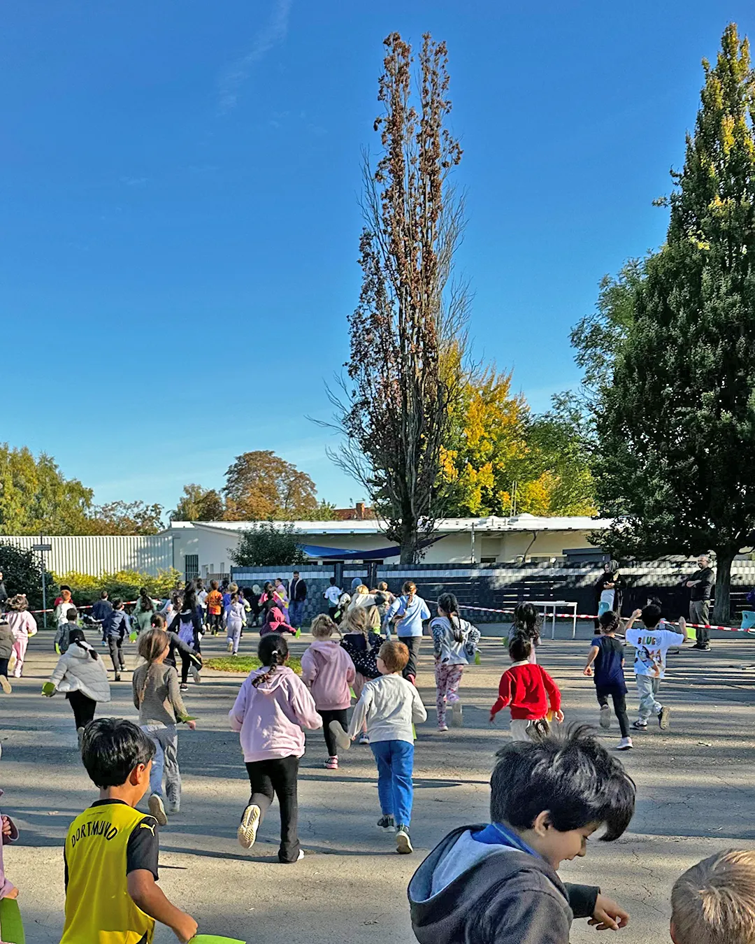 Schüler*innen laufen auf dem Schulgelände einen vorgesteckten Parccours ab.