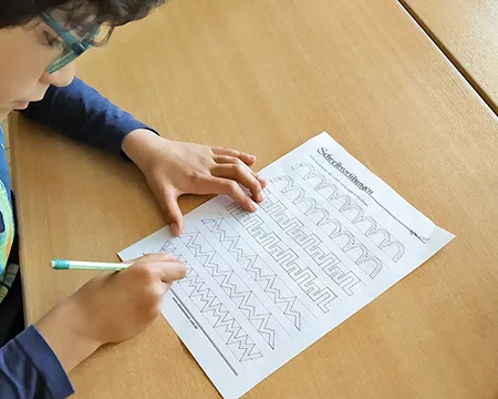 Kinderhände arbeiten an Materialien aus der Schuleingangsphase.