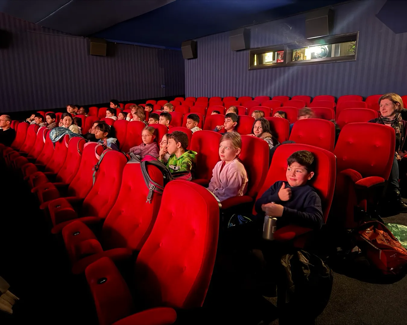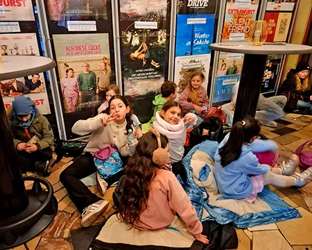 Schüler*innen auf dem Weg zum Kino, vor dem Kino und im Kinosaal.