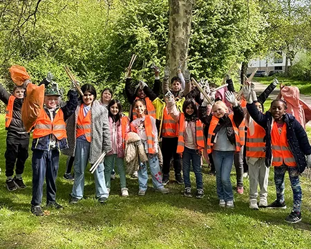 Schüler*innen streifen durch Grünanlagen und sammeln Müll und stellen sich zum gemeinsamen Klassenfoto auf